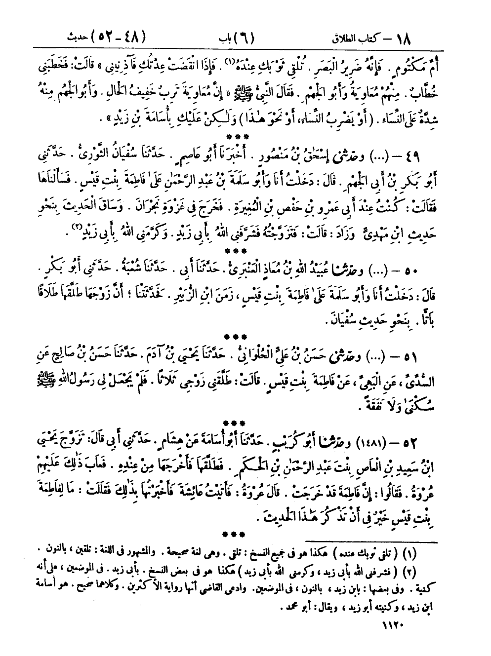 ٥٢ - (١٤٨١) وحَدَّثَنَا أَبُو كُرَيْبٍ، حَدَّثَنَا أَبُو أُسَامَةَ، عَنْ هِشَامٍ، حَدَّثَنِي أَبِي، قَالَ: تَزَوَّجَ يَحْيَى بْنُ سَعِيدِ بْنِ الْعَاصِ، بِنْتَ عَبْدِ الرَّحْمَنِ بْنِ الْحَكَمِ، فَطَلَّقَهَا، فَأَخْرَجَهَا مِنْ عِنْدِهِ، فَعَابَ ذَلِكَ عَلَيْهِمْ عُرْوَةُ، فَقَالُوا: إِنَّ فَاطِمَةَ قَدْ خَرَجَتْ، قَالَ عُرْوَةُ: فَأَتَيْتُ عَائِشَةَ، فَأَخْبَرْتُهَا بِذَلِكَ، فَقَالَتْ: «مَا لِفَاطِمَةَ بِنْتِ قَيْسٍ خَيْرٌ فِي أَنْ تَذْكُرَ هَذَا الْحَدِيثَ»