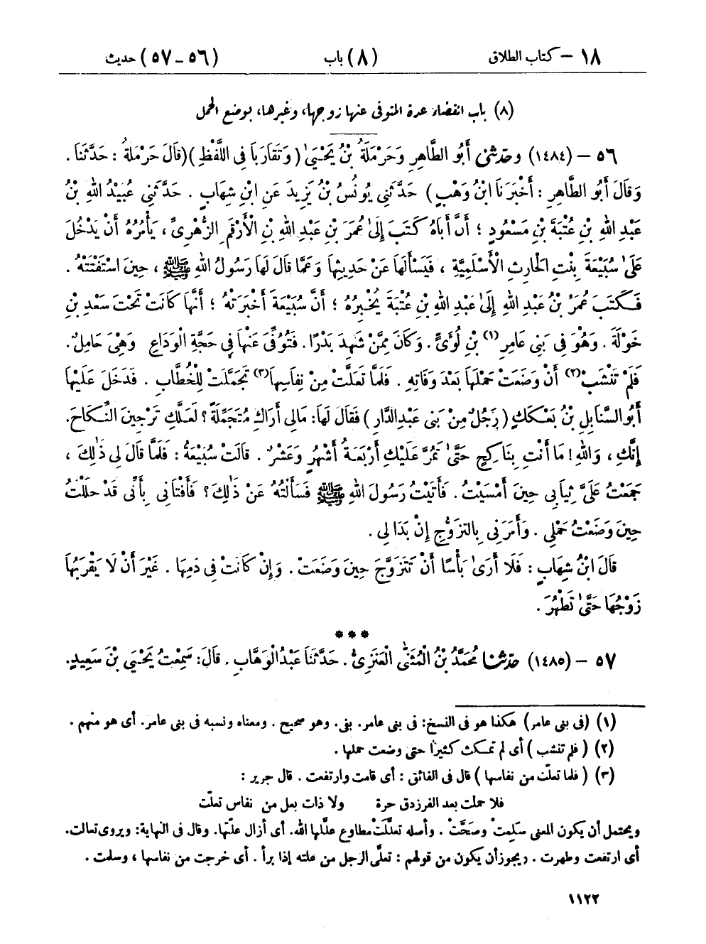 ٥٦ - (١٤٨٤) وحَدَّثَنِي أَبُو الطَّاهِرِ، وَحَرْمَلَةُ بْنُ يَحْيَى، وَتَقَارَبَا فِي اللَّفْظِ، قَالَ حَرْمَلَةُ: حَدَّثَنَا، وقَالَ أَبُو الطَّاهِرِ: أَخْبَرَنَا ابْنُ وَهْبٍ، حَدَّثَنِي يُونُسُ بْنُ يَزِيدَ، عَنِ ابْنِ شِهَابٍ، حَدَّثَنِي عُبَيْدُ اللهِ بْنُ عَبْدِ اللهِ بْنِ عُتْبَةَ بْنِ مَسْعُودٍ، أَنَّ أَبَاهُ كَتَبَ إِلَى عُمَرَ بْنِ عَبْدِ اللهِ بْنِ الْأَرْقَمِ الزُّهْرِيِّ، يَأْمُرُهُ أَنْ يَدْخُلَ عَلَى سُبَيْعَةَ بِنْتِ الْحَارِثِ الْأَسْلَمِيَّةِ، فَيَسْأَلَهَا عَنْ حَدِيثِهَا، وَعَمَّا قَالَ لَهَا رَسُولُ اللهِ صَلَّى اللهُ عَلَيْهِ وَسَلَّمَ حِينَ اسْتَفْتَتْهُ، فَكَتَبَ عُمَرُ بْنُ عَبْدِ اللهِ إِلَى عَبْدِ اللهِ بْنِ عُتْبَةَ يُخْبِرُهُ، أَنَّ سُبَيْعَةَ أَخْبَرَتْهُ: أَنَّهَا كَانَتْ تَحْتَ سَعْدِ بْنِ خَوْلَةَ وَهُوَ فِي بَنِي عَامِرِ بْنِ لُؤَيٍّ، وَكَانَ مِمَّنْ شَهِدَ بَدْرًا، فَتُوُفِّيَ عَنْهَا فِي حَجَّةِ الْوَدَاعِ وَهِيَ حَامِلٌ، فَلَمْ تَنْشَبْ أَنْ وَضَعَتْ حَمْلَهَا بَعْدَ وَفَاتِهِ، فَلَمَّا تَعَلَّتْ مِنْ نِفَاسِهَا، تَجَمَّلَتْ لِلْخُطَّابِ، فَدَخَلَ عَلَيْهَا أَبُو السَّنَابِلِ بْنُ بَعْكَكٍ - رَجُلٌ مِنْ بَنِي عَبْدِ الدَّارِ - فَقَالَ لَهَا: مَا لِي أَرَاكِ مُتَجَمِّلَةً؟ لَعَلَّكِ تَرْجِينَ النِّكَاحَ، إِنَّكِ، وَاللهِ، مَا أَنْتِ بِنَاكِحٍ حَتَّى تَمُرَّ عَلَيْكِ أَرْبَعَةُ أَشْهُرٍ وَعَشْرٌ، قَالَتْ سُبَيْعَةُ: فَلَمَّا قَالَ لِي ذَلِكَ، جَمَعْتُ عَلَيَّ ثِيَابِي حِينَ أَمْسَيْتُ، فَأَتَيْتُ رَسُولَ اللهِ صَلَّى اللهُ عَلَيْهِ وَسَلَّمَ، فَسَأَلْتُهُ عَنْ ذَلِكَ، «فَأَفْتَانِي بِأَنِّي قَدْ حَلَلْتُ حِينَ وَضَعْتُ حَمْلِي، وَأَمَرَنِي بِالتَّزَوُّجِ إِنْ بَدَا لِي»، قَالَ ابْنُ شِهَابٍ: «فَلَا أَرَى بَأْسًا أَنْ تَتَزَوَّجَ حِينَ وَضَعَتْ، وَإِنْ كَانَتْ فِي دَمِهَا، غَيْرَ أَنَّهُ لَا يَقْرَبُهَا زَوْجُهَا حَتَّى تَطْهُرَ»