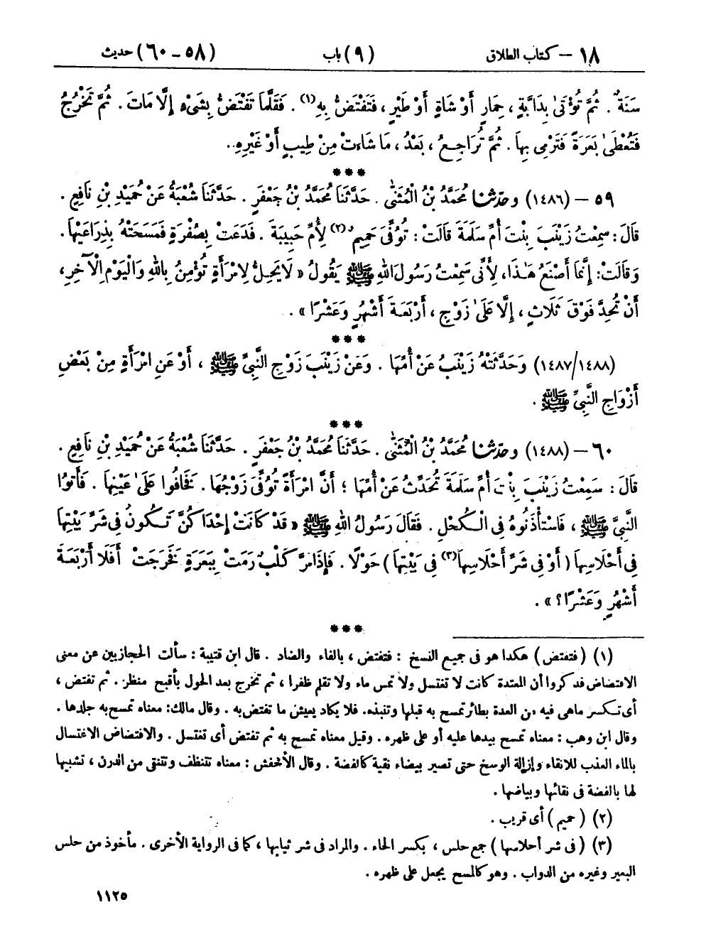 ٦٠ - (١٤٨٨) وحَدَّثَنَا مُحَمَّدُ بْنُ الْمُثَنَّى، حَدَّثَنَا مُحَمَّدُ بْنُ جَعْفَرٍ، حَدَّثَنَا شُعْبَةُ، عَنْ حُمَيْدِ بْنِ نَافِعٍ، قَالَ: سَمِعْتُ زَيْنَبَ بِنْتَ أُمِّ سَلَمَةَ، تُحَدِّثُ عَنْ أُمِّهَا، أَنَّ امْرَأَةً تُوُفِّيَ زَوْجُهَا، فَخَافُوا عَلَى عَيْنِهَا، فَأَتَوُا النَّبِيَّ صَلَّى اللهُ عَلَيْهِ وَسَلَّمَ، فَاسْتَأْذَنُوهُ فِي الْكُحْلِ، فَقَالَ رَسُولُ اللهِ صَلَّى اللهُ عَلَيْهِ وَسَلَّمَ: «قَدْ كَانَتْ إِحْدَاكُنَّ تَكُونُ فِي شَرِّ بَيْتِهَا فِي أَحْلَاسِهَا - أَوْ فِي شَرِّ أَحْلَاسِهَا - فِي بَيْتِهَا حَوْلًا، فَإِذَا مَرَّ كَلْبٌ رَمَتْ بِبَعْرَةٍ، فَخَرَجَتْ، أَفَلَا أَرْبَعَةَ أَشْهُرٍ وَعَشْرًا؟»،