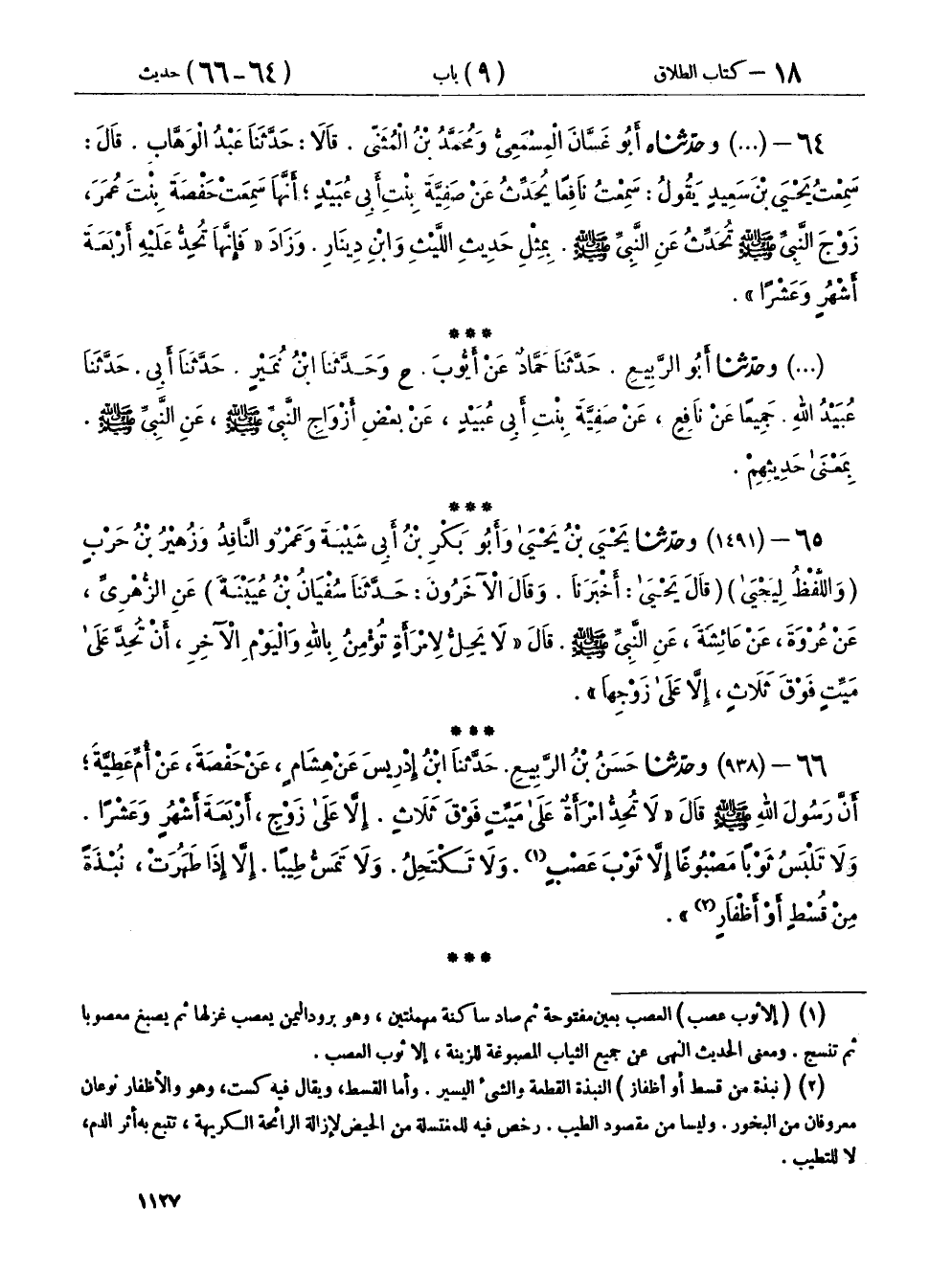 ٦٤ - (١٤٩٠) وَحَدَّثَنَاهُ أَبُو غَسَّانَ الْمِسْمَعِيُّ، وَمُحَمَّدُ بْنُ الْمُثَنَّى، قَالَا: حَدَّثَنَا عَبْدُ الْوَهَّابِ، قَالَ: سَمِعْتُ يَحْيَى بْنَ سَعِيدٍ، يَقُولُ: سَمِعْتُ نَافِعًا، يُحَدِّثُ عَنْ صَفِيَّةَ بِنْتِ أَبِي عُبَيْدٍ، أَنَّهَا سَمِعَتْ حَفْصَةَ بِنْتَ عُمَرَ، زَوْجَ النَّبِيِّ صَلَّى اللهُ عَلَيْهِ وَسَلَّمَ تُحَدِّثُ عَنِ النَّبِيِّ صَلَّى اللهُ عَلَيْهِ وَسَلَّمَ بِمِثْلِ حَدِيثِ اللَّيْثِ، وَابْنِ دِينَارٍ، وَزَادَ فَإِنَّهَا تُحِدُّ عَلَيْهِ أَرْبَعَةَ أَشْهُرٍ وَعَشْرًا.