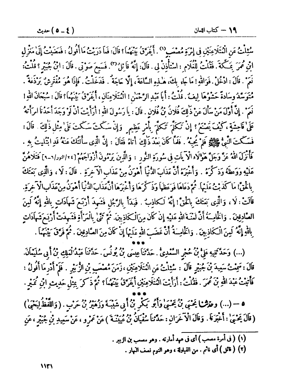 (١٤٩٣) وحَدَّثَنِيهِ عَلِيُّ بْنُ حُجْرٍ السَّعْدِيُّ، حَدَّثَنَا عِيسَى بْنُ يُونُسَ، حَدَّثَنَا عَبْدُ الْمَلِكِ بْنُ أَبِي سُلَيْمَانَ، قَالَ: سَمِعْتُ سَعِيدَ بْنَ جُبَيْرٍ، قَالَ: سُئِلْتُ عَنِ الْمُتَلَاعِنَيْنِ زَمَنَ مُصْعَبِ بْنِ الزُّبَيْرِ، فَلَمْ أَدْرِ مَا أَقُولُ فَأَتَيْتُ عَبْدَ اللهِ بْنَ عُمَرَ، فَقُلْتُ: أَرَأَيْتَ الْمُتَلَاعِنَيْنِ أَيُفَرَّقُ بَيْنَهُمَا؟ ثُمَّ ذَكَرَ بِمِثْلِ حَدِيثِ ابْنِ نُمَيْرٍ