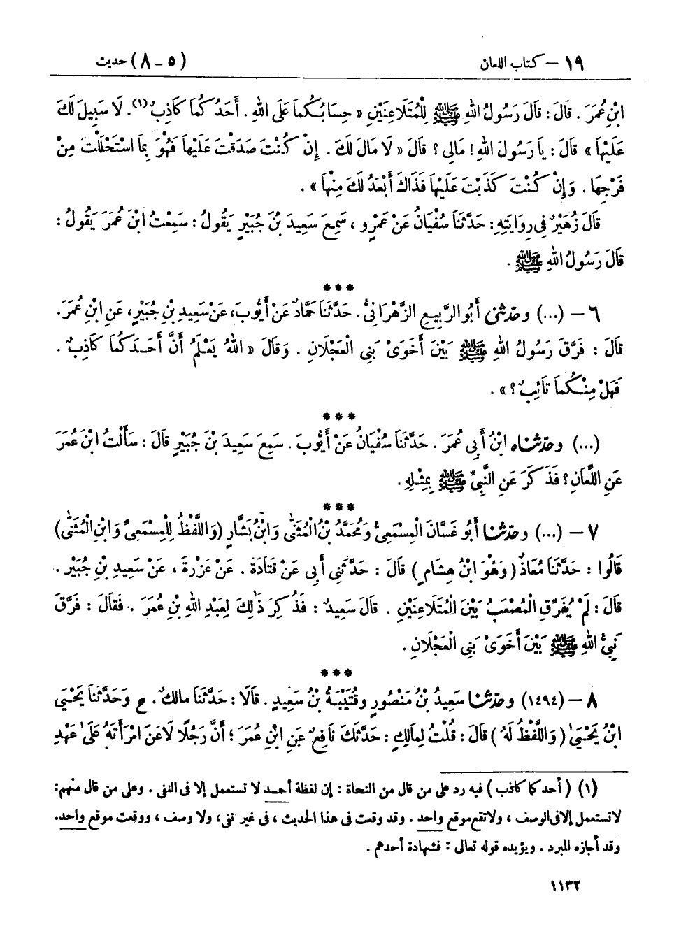 ٦ - (١٤٩٣) وحَدَّثَنِي أَبُو الرَّبِيعِ الزَّهْرَانِيُّ، حَدَّثَنَا حَمَّادٌ، عَنْ أَيُّوبَ، عَنْ سَعِيدِ بْنِ جُبَيْرٍ، عَنِ ابْنِ عُمَرَ، قَالَ: فَرَّقَ رَسُولُ اللهِ صَلَّى اللهُ عَلَيْهِ وَسَلَّمَ بَيْنَ أَخَوَيْ بَنِي الْعَجْلَانِ، وَقَالَ: «اللهُ يَعْلَمُ أَنَّ أَحَدَكُمَا كَاذِبٌ، فَهَلْ مِنْكُمَا تَائِبٌ»؟،