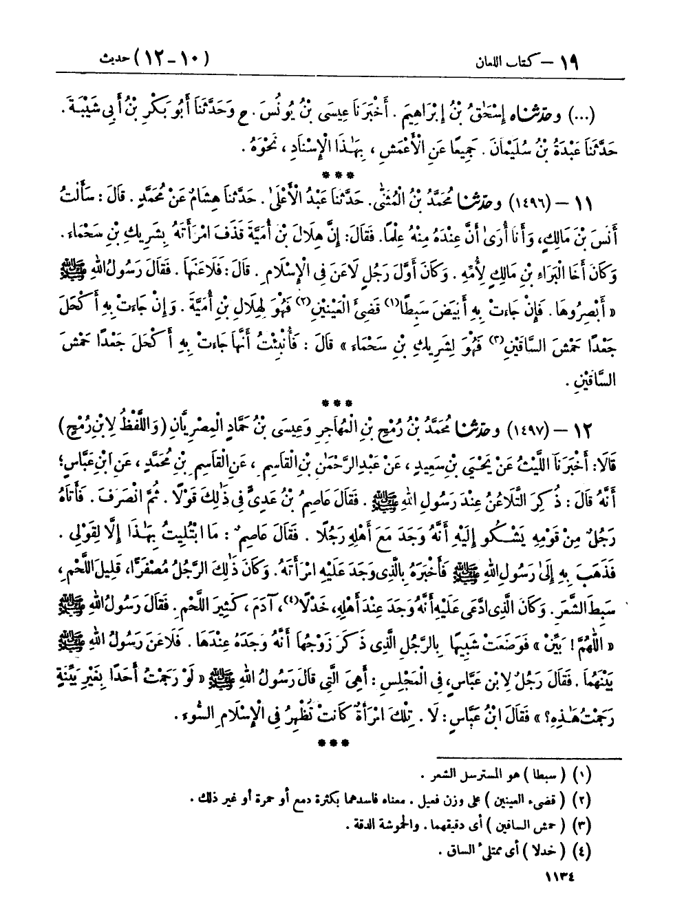 ١١ - (١٤٩٦) وحَدَّثَنَا مُحَمَّدُ بْنُ الْمُثَنَّى، حَدَّثَنَا عَبْدُ الْأَعْلَى، حَدَّثَنَا هِشَامٌ، عَنْ مُحَمَّدٍ، قَالَ: سَأَلْتُ أَنَسَ بْنَ مَالِكٍ، وَأَنَا أُرَى أَنَّ عِنْدَهُ مِنْهُ عِلْمًا، فَقَالَ: إِنَّ هِلَالَ بْنَ أُمَيَّةَ قَذَفَ امْرَأَتَهُ بِشَرِيكِ ابْنِ سَحْمَاءَ، وَكَانَ أَخَا الْبَرَاءِ بْنِ مَالِكٍ لِأُمِّهِ، وَكَانَ أَوَّلَ رَجُلٍ لَاعَنَ فِي الْإِسْلَامِ، قَالَ: فَلَاعَنَهَا، فَقَالَ رَسُولُ اللهِ صَلَّى اللهُ عَلَيْهِ وَسَلَّمَ: «أَبْصِرُوهَا، فَإِنْ جَاءَتْ بِهِ أَبْيَضَ سَبِطًا قَضِيءَ الْعَيْنَيْنِ فَهُوَ لِهِلَالِ بْنِ أُمَيَّةَ، وَإِنْ جَاءَتْ بِهِ أَكْحَلَ جَعْدًا حَمْشَ السَّاقَيْنِ فَهُوَ لِشَرِيكِ ابْنِ سَحْمَاءَ»، قَالَ: فَأُنْبِئْتُ أَنَّهَا جَاءَتْ بِهِ أَكْحَلَ جَعْدًا حَمْشَ السَّاقَيْنِ