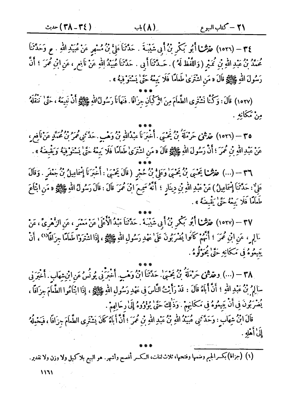 ٣٤ - (١٥٢٦) حَدَّثَنَا أَبُو بَكْرِ بْنُ أَبِي شَيْبَةَ، حَدَّثَنَا عَلِيُّ بْنُ مُسْهِرٍ، عَنْ عُبَيْدِ اللهِ، ح وحَدَّثَنَا مُحَمَّدُ بْنُ عَبْدِ اللهِ بْنِ نُمَيْرٍ، وَاللَّفْظُ لَهُ، حَدَّثَنَا أَبِي، حَدَّثَنَا عُبَيْدُ اللهِ، عَنْ نَافِعٍ، عَنِ ابْنِ عُمَرَ، أَنَّ رَسُولَ اللهِ صَلَّى اللهُ عَلَيْهِ وَسَلَّمَ قَالَ: «مَنِ اشْتَرَى طَعَامًا فَلَا يَبِعْهُ حَتَّى يَسْتَوْفِيَهُ»،
