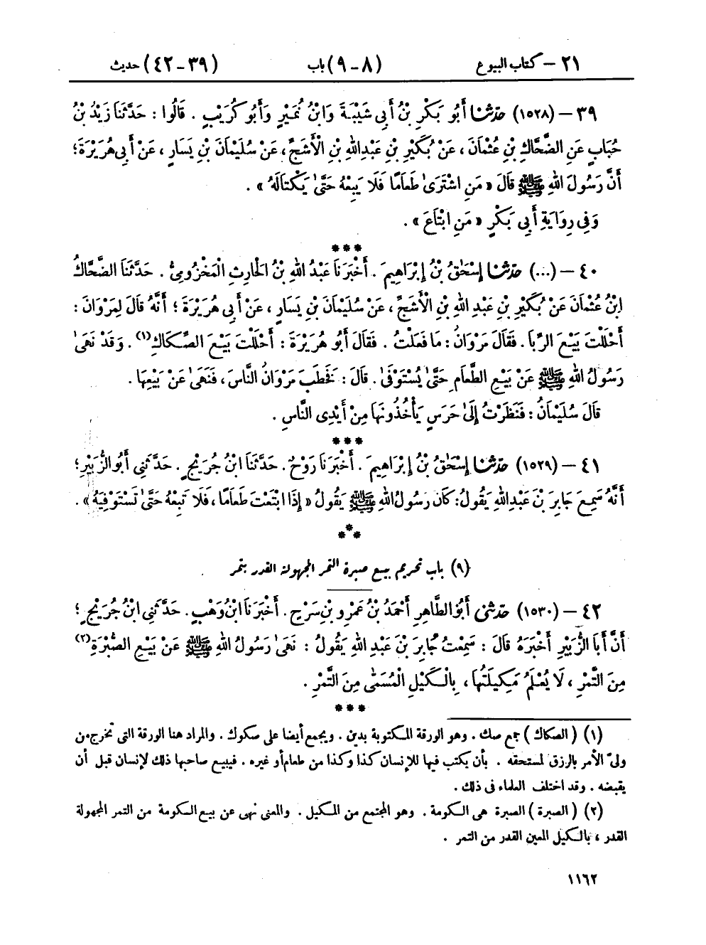 ٣٩ - (١٥٢٨) حَدَّثَنَا أَبُو بَكْرِ بْنُ أَبِي شَيْبَةَ، وَابْنُ نُمَيْرٍ، وَأَبُو كُرَيْبٍ، قَالُوا: حَدَّثَنَا زَيْدُ بْنُ حُبَابٍ، عَنِ الضَّحَّاكِ بْنِ عُثْمَانَ، عَنْ بُكَيْرِ بْنِ عَبْدِ اللهِ بْنِ الْأَشَجِّ، عَنْ سُلَيْمَانَ بْنِ يَسَارٍ، عَنْ أَبِي هُرَيْرَةَ، أَنَّ رَسُولَ اللهِ صَلَّى اللهُ عَلَيْهِ وَسَلَّمَ قَالَ: «مَنِ اشْتَرَى طَعَامًا فَلَا يَبِعْهُ حَتَّى يَكْتَالَهُ»، وَفِي رِوَايَةِ أَبِي بَكْرٍ: «مَنِ ابْتَاعَ»
