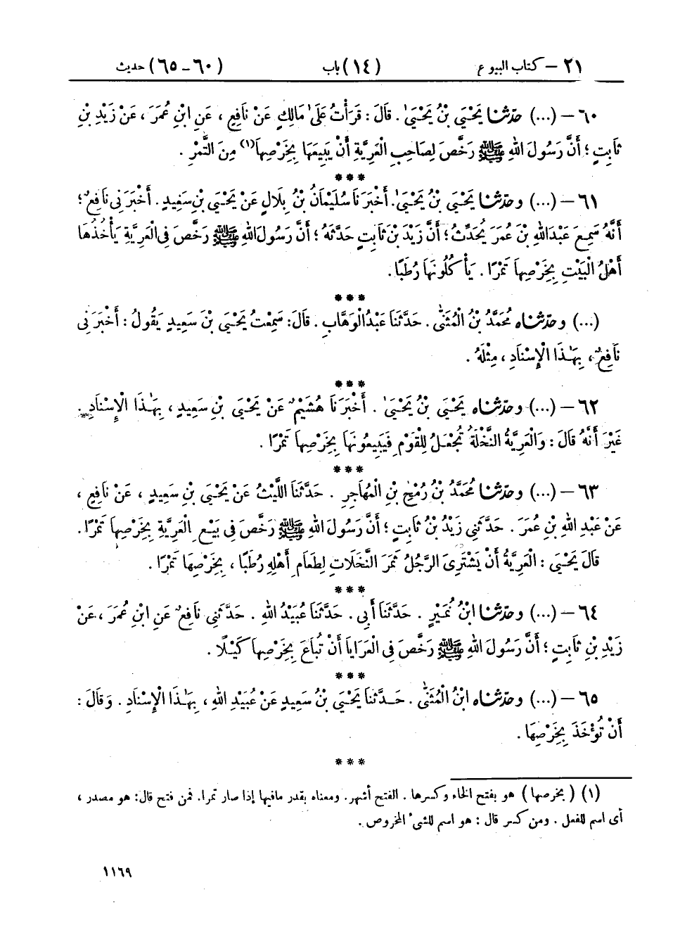 ٦١ - (١٥٣٩) وحَدَّثَنَا يَحْيَى بْنُ يَحْيَى، أَخْبَرَنَا سُلَيْمَانُ بْنُ بِلَالٍ، عَنْ يَحْيَى بْنِ سَعِيدٍ، أَخْبَرَنِي نَافِعٌ، أَنَّهُ سَمِعَ عَبْدَ اللهِ بْنَ عُمَرَ، يُحَدِّثُ أَنَّ زَيْدَ بْنَ ثَابِتٍ، حَدَّثَهُ، «أَنَّ رَسُولَ اللهِ صَلَّى اللهُ عَلَيْهِ وَسَلَّمَ رَخَّصَ فِي الْعَرِيَّةِ يَأْخُذُهَا أَهْلُ الْبَيْتِ بِخَرْصِهَا تَمْرًا، يَأْكُلُونَهَا رُطَبًا»،
