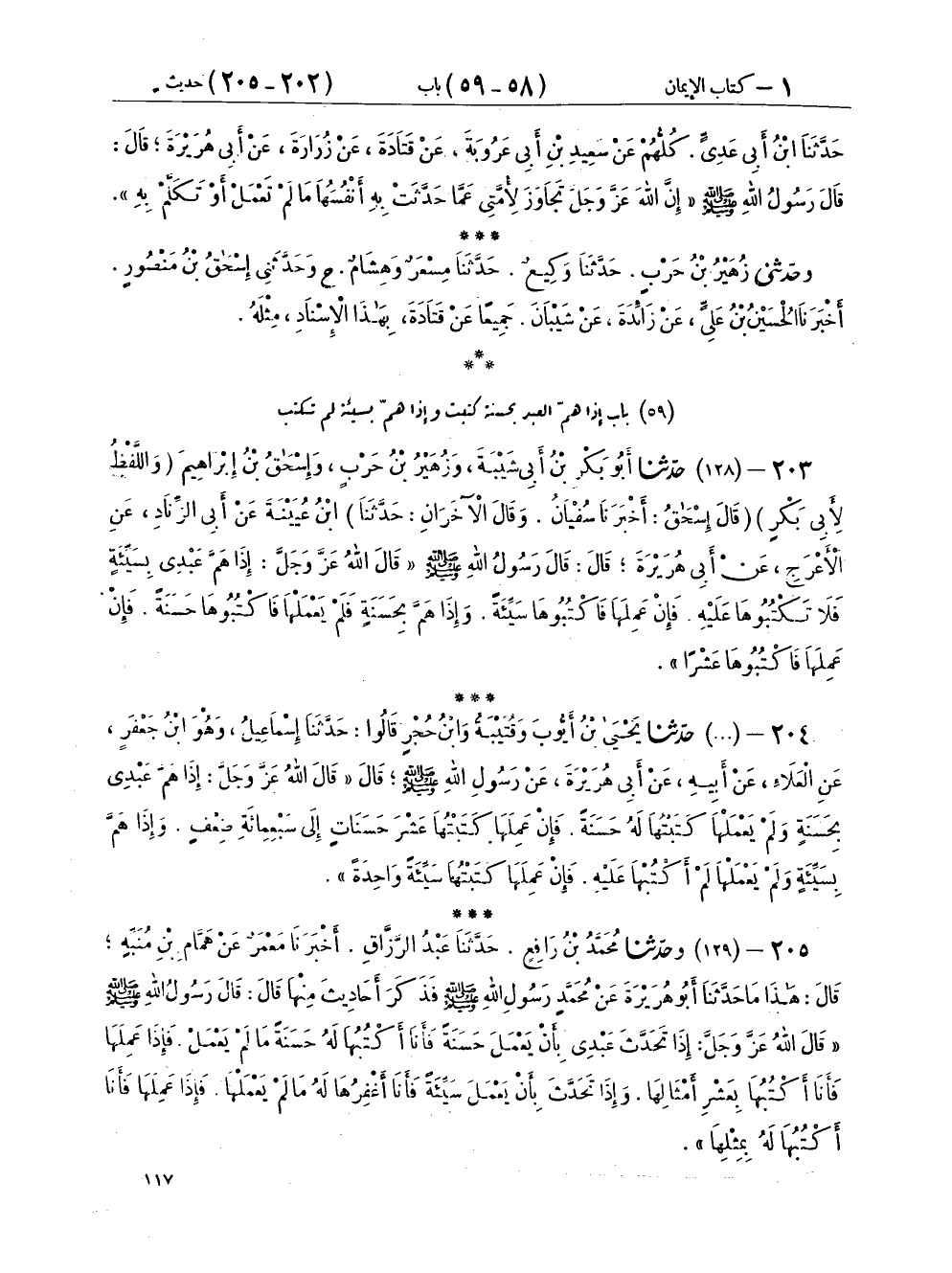 ٢٠٥ - (١٢٩) وَحَدَّثَنَا مُحَمَّدُ بْنُ رَافِعٍ، حَدَّثَنَا عَبْدُ الرَّزَّاقِ، أَخْبَرَنَا مَعْمَرٌ، عَنْ هَمَّامِ بْنِ مُنَبِّهٍ، قَالَ: هَذَا مَا حَدَّثَنَا أَبُو هُرَيْرَةَ، عَنْ مُحَمَّدٍ رَسُولِ اللهِ صَلَّى اللهُ عَلَيْهِ وَسَلَّمَ، فَذَكَرَ أَحَادِيثَ مِنْهَا قَالَ: قَالَ رَسُولُ اللهِ صَلَّى اللهُ عَلَيْهِ وَسَلَّمَ: " قَالَ اللهُ عَزَّ وَجَلَّ: إِذَا تَحَدَّثَ عَبْدِي بِأَنْ يَعْمَلَ حَسَنَةً، فَأَنَا أَكْتُبُهَا لَهُ حَسَنَةً مَا لَمْ يَعْمَلْ، فَإِذَا عَمِلَهَا، فَأَنَا أَكْتُبُهَا بِعَشْرِ أَمْثَالِهَا، وَإِذَا تَحَدَّثَ بِأَنْ يَعْمَلَ سَيِّئَةً، فَأَنَا أَغْفِرُهَا لَهُ مَا لَمْ يَعْمَلْهَا، فَإِذَا عَمِلَهَا، فَأَنَا أَكْتُبُهَا لَهُ بِمِثْلِهَا " وَقَالَ رَسُولُ اللهِ صَلَّى اللهُ عَلَيْهِ وَسَلَّمَ: " قَالَتِ الْملَائِكَةُ: رَبِّ، ذَاكَ عَبْدُكَ يُرِيدُ أَنْ يَعْمَلَ سَيِّئَةً، وَهُوَ أَبْصَرُ بِهِ، فَقَالَ: ارْقُبُوهُ فَإِنْ عَمِلَهَا فَاكْتُبُوهَا لَهُ بِمِثْلِهَا، وَإِنْ تَرَكَهَا فَاكْتُبُوهَا لَهُ حَسَنَةً، إِنَّمَا تَرَكَهَا مِنْ جَرَّايَ " وَقَالَ رسولُ اللهِ صَلَّى اللهُ عَلَيْهِ وَسَلَّمَ: «إِذَا أَحْسَنَ أَحَدُكُمْ إِسْلَامَهُ، فَكُلُّ حَسَنَةٍ يَعْمَلُهَا تُكْتَبُ بِعَشْرِ أَمْثَالِهَا إِلَى سَبْعِ مِائَةِ ضِعْفٍ، وَكُلُّ سَيِّئَةٍ يَعْمَلُهَا تُكْتَبُ بِمِثْلِهَا حَتَّى يَلْقَى اللهَ»