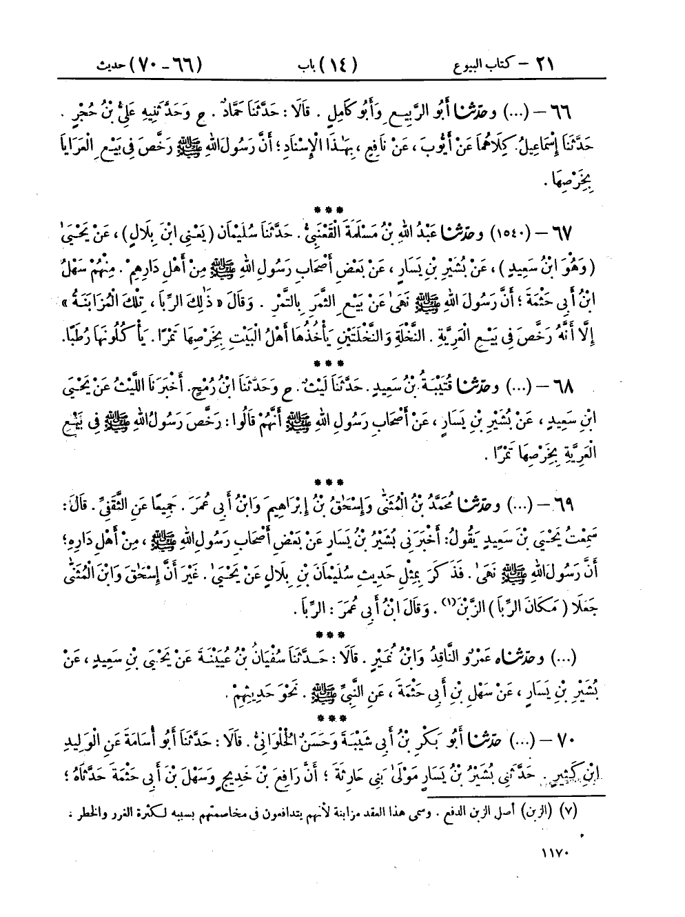 ٦٩ - (١٥٤٠) وحَدَّثَنَا مُحَمَّدُ بْنُ الْمُثَنَّى، وَإِسْحَاقُ بْنُ إِبْرَاهِيمَ، وَابْنُ أَبِي عُمَرَ جَمِيعًا، عَنِ الثَّقَفِيِّ، قَالَ: سَمِعْتُ يَحْيَى بْنَ سَعِيدٍ، يَقُولُ: أَخْبَرَنِي بُشَيْرُ بْنُ يَسَارٍ، عَنْ بَعْضِ أَصْحَابِ رَسُولِ اللهِ صَلَّى اللهُ عَلَيْهِ وَسَلَّمَ مِنْ أَهْلِ دَارِهِ، أَنَّ رَسُولَ اللهِ صَلَّى اللهُ عَلَيْهِ وَسَلَّمَ نَهَى، فَذَكَرَ بِمِثْلِ حَدِيثِ سُلَيْمَانَ بْنِ بِلَالٍ، عَنْ يَحْيَى، غَيْرَ أَنَّ إِسْحَاقَ، وَابْنَ الْمُثَنَّى جَعَلَا مَكَانَ الرِّبَا الزَّبْنَ، وقَالَ ابْنُ أَبِي عُمَرَ: الرِّبَا،