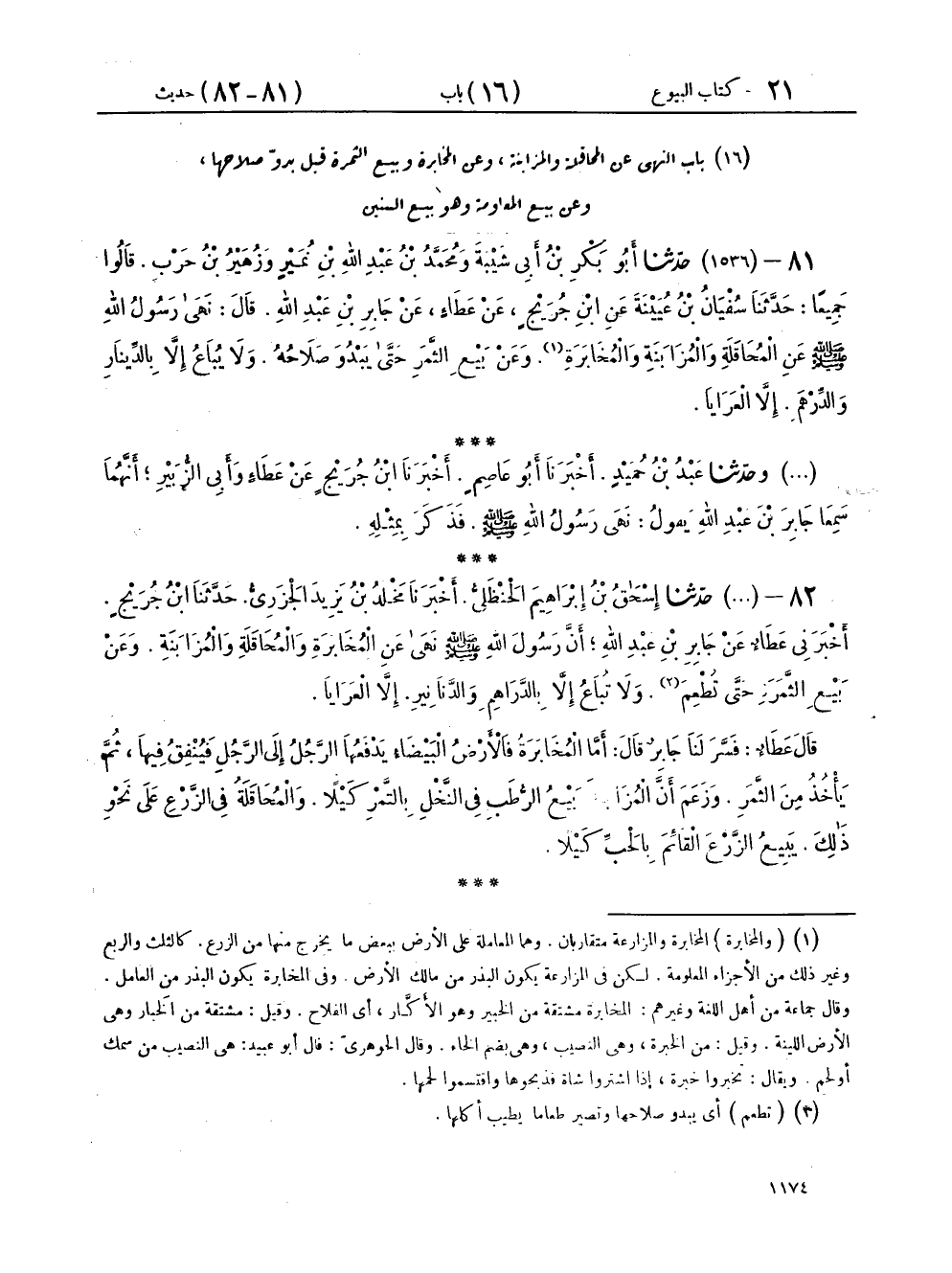٨١ - (١٥٣٦) حَدَّثَنَا أَبُو بَكْرِ بْنُ أَبِي شَيْبَةَ، وَمُحَمَّدُ بْنُ عَبْدِ اللهِ بْنِ نُمَيْرٍ، وَزُهَيْرُ بْنُ حَرْبٍ، قَالُوا جَمِيعًا: حَدَّثَنَا سُفْيَانُ بْنُ عُيَيْنَةَ، عَنِ ابْنِ جُرَيْجٍ، عَنْ عَطَاءٍ، عَنْ جَابِرِ بْنِ عَبْدِ اللهِ، قَالَ: «نَهَى رَسُولُ اللهِ صَلَّى اللهُ عَلَيْهِ وَسَلَّمَ عَنِ الْمُحَاقَلَةِ وَالْمُزَابَنَةِ وَالْمُخَابَرَةِ، وَعَنْ بَيْعِ الثَّمَرِ حَتَّى يَبْدُوَ صَلَاحُهُ، وَلَا يُبَاعُ إِلَّا بِالدِّينَارِ وَالدِّرْهَمِ، إِلَّا الْعَرَايَا»،