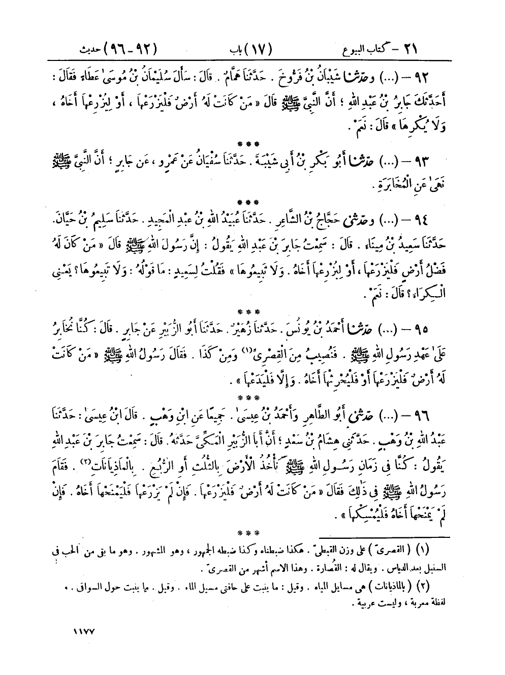 ٩٤ - (١٥٣٦) وحَدَّثَنِي حَجَّاجُ بْنُ الشَّاعِرِ، حَدَّثَنَا عُبَيْدُ اللهِ بْنُ عَبْدِ الْمَجِيدِ، حَدَّثَنَا سَلِيمُ بْنُ حَيَّانَ، حَدَّثَنَا سَعِيدُ بْنُ مِينَاءَ، قَالَ: سَمِعْتُ جَابِرَ بْنَ عَبْدِ اللهِ، يَقُولُ: إِنَّ رَسُولَ اللهِ صَلَّى اللهُ عَلَيْهِ وَسَلَّمَ قَالَ: «مَنْ كَانَ لَهُ فَضْلُ أَرْضٍ فَلْيَزْرَعْهَا، أَوْ لِيُزْرِعْهَا أَخَاهُ، وَلَا تَبِيعُوهَا»، فَقُلْتُ لِسَعِيدٍ: مَا قَوْلُهُ، وَلَا تَبِيعُوهَا يَعْنِي الْكِرَاءَ؟ قَالَ: «نَعَمْ»