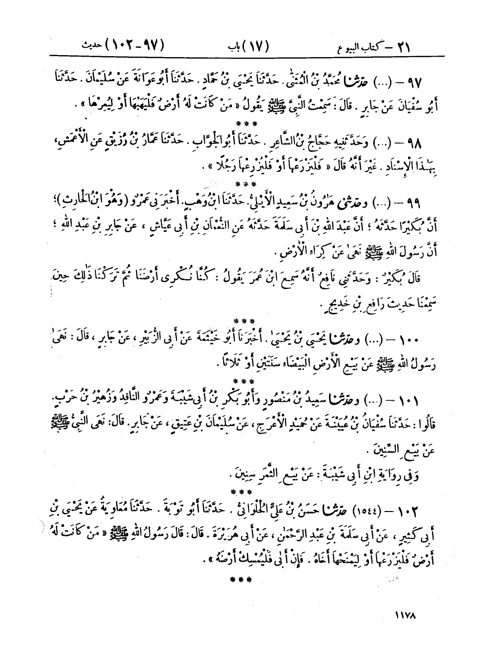 ٩٨ - (١٥٣٦) وحَدَّثَنِيهِ حَجَّاجُ بْنُ الشَّاعِرِ، حَدَّثَنَا أَبُو الْجَوَّابِ، حَدَّثَنَا عَمَّارُ بْنُ رُزَيْقٍ، عَنِ الْأَعْمَشِ، بِهَذَا الْإِسْنَادِ غَيْرَ أَنَّهُ قَالَ: فَلْيَزْرَعْهَا، أَوْ فَلْيُزْرِعْهَا رَجُلًا