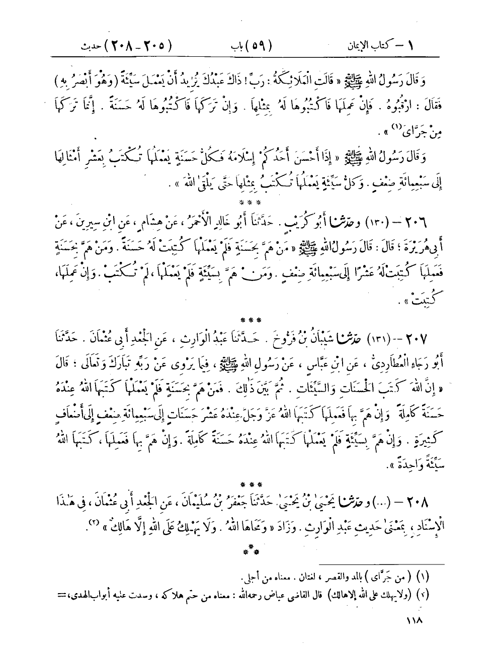 ٢٠٧ - (١٣١) حَدَّثَنَا شَيْبَانُ بْنُ فَرُّوخَ، حَدَّثَنَا عَبْدُ الْوَارِثِ، عَنِ الْجَعْدِ أَبِي عُثْمَانَ، حَدَّثَنَا أَبُو رَجَاءٍ الْعُطَارِدِيُّ، عَنِ ابْنِ عَبَّاسٍ، عَنْ رَسُولِ اللهِ صَلَّى اللهُ عَلَيْهِ وَسَلَّمَ فِيمَا يَرْوِي عَنْ رَبِّهِ تَبَارَكَ وَتَعَالَى، قَالَ: «إِنَّ اللهَ كَتَبَ الْحَسَنَاتِ وَالسَّيِّئَاتِ، ثُمَّ بَيَّنَ ذَلِكَ، فَمَنْ هَمَّ بِحَسَنَةٍ فَلَمْ يَعْمَلْهَا، كَتَبَهَا اللهُ عِنْدَهُ حَسَنَةً كَامِلَةً، وَإِنْ هَمَّ بِهَا فَعَمِلَهَا، كَتَبَهَا اللهُ عَزَّ وَجَلَّ عِنْدَهُ عَشْرَ حَسَنَاتٍ إِلَى سَبْعِ مِائَةِ ضِعْفٍ إِلَى أَضْعَافٍ كَثِيرَةٍ، وَإِنْ هَمَّ بِسَيِّئَةٍ فَلَمْ يَعْمَلْهَا، كَتَبَهَا اللهُ عِنْدَهُ حَسَنَةً كَامِلَةً، وَإِنْ هَمَّ بِهَا فَعَمِلَهَا، كَتَبَهَا اللهُ سَيِّئَةً وَاحِدَةً»،