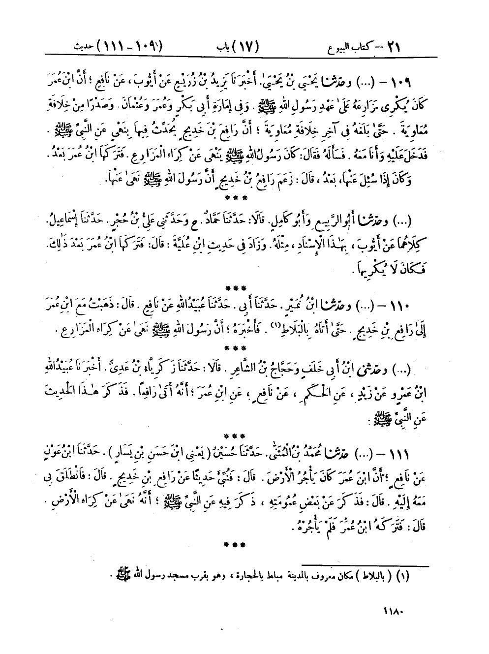 ١١٠ - (١٥٤٧) وحَدَّثَنَا ابْنُ نُمَيْرٍ، حَدَّثَنَا أَبِي، حَدَّثَنَا عُبَيْدُ اللهِ، عَنْ نَافِعٍ، قَالَ: ذَهَبْتُ مَعَ ابْنِ عُمَرَ إِلَى رَافِعِ بْنِ خَدِيجٍ حَتَّى أَتَاهُ بِالْبَلَاطِ، فَأَخْبَرَهُ، «أَنَّ رَسُولَ اللهِ صَلَّى اللهُ عَلَيْهِ وَسَلَّمَ نَهَى عَنْ كِرَاءِ الْمَزَارِعِ»،