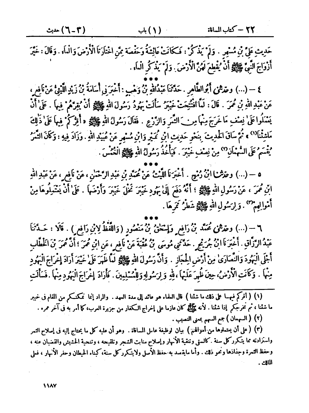 [ ش (أقركم فيها على ذلك ما شئنا) قال العلماء هو عائد الى مدة العهد والمراد إنما نمكنكم من المقام في خيبر ما شئنا ثم نخرجكم إذا شئنا لأنه صلى الله عليه وسلم كان عازما على إخراج الكفار من جزيرة العرب كما أمر به في آخر عمره