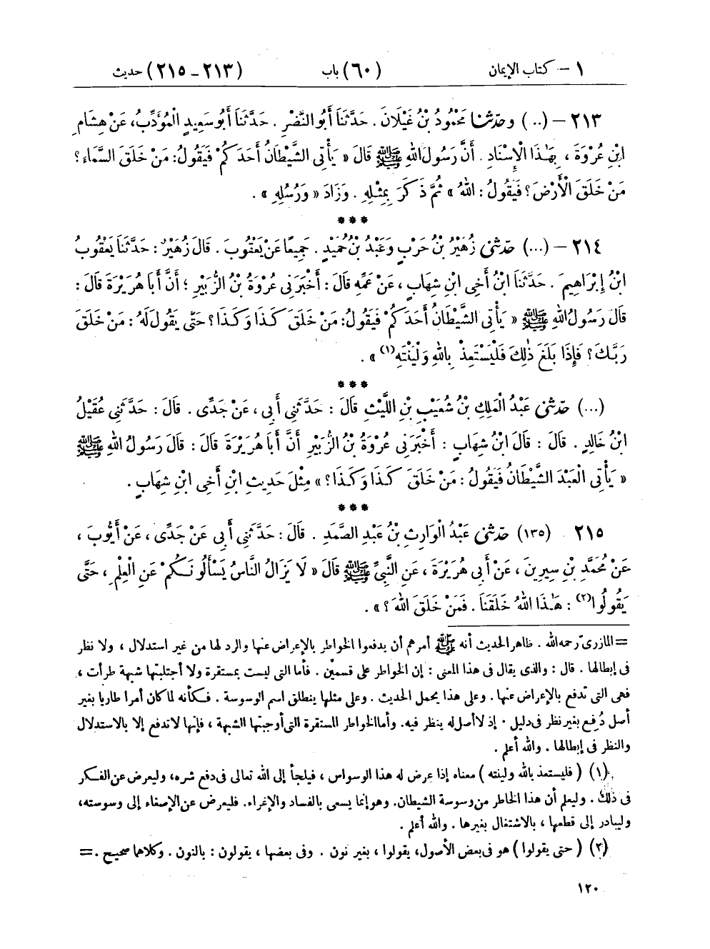 ٢١٤ - (١٣٤) حَدَّثَنِي زُهَيْرُ بْنُ حَرْبٍ، وَعَبْدُ بْنُ حُمَيْدٍ، جَمِيعًا عَنْ يَعْقُوبَ، قَالَ زُهَيْرٌ: حَدَّثَنَا يَعْقُوبُ بْنُ إِبْرَاهِيمَ، حَدَّثَنَا ابْنُ أَخِي ابْنِ شِهَابٍ، عَنْ عَمِّهِ، قَالَ: أَخْبَرَنِي عُرْوَةُ بْنُ الزُّبَيْرِ، أَنَّ أَبَا هُرَيْرَةَ، قَالَ: قَالَ رَسُولُ اللهِ صَلَّى اللهُ عَلَيْهِ وَسَلَّمَ: " يَأْتِي الشَّيْطَانُ أَحَدَكُمْ فَيَقُولَ: مَنْ خَلَقَ كَذَا وَكَذَا؟ حَتَّى يَقُولَ لَهُ: مَنْ خَلَقَ رَبَّكَ؟ فَإِذَا بَلَغَ ذَلِكَ، فَلْيَسْتَعِذْ بِاللهِ وَلْيَنْتَهِ "،