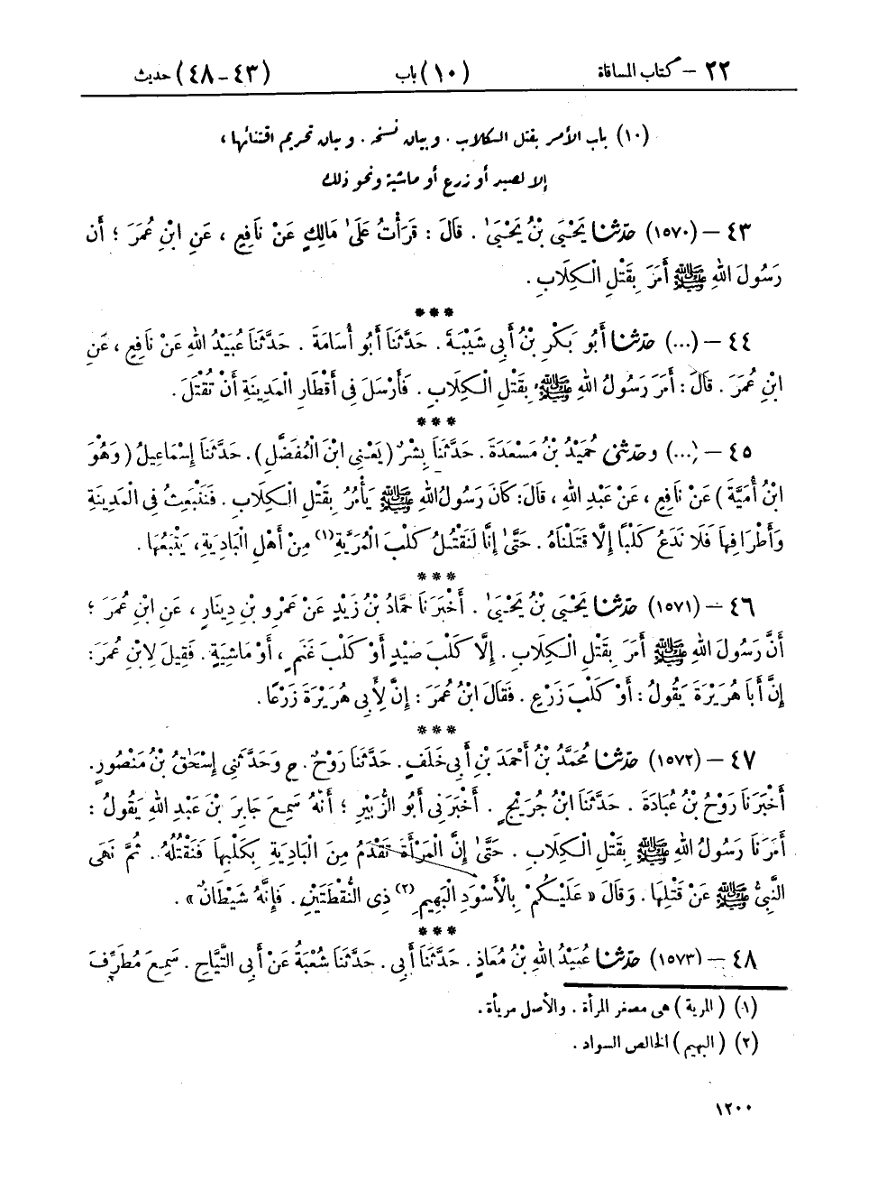 ٤٣ - (١٥٧٠) حَدَّثَنَا يَحْيَى بْنُ يَحْيَى، قَالَ: قَرَأْتُ عَلَى مَالِكٍ، عَنْ نَافِعٍ، عَنِ ابْنِ عُمَرَ، «أَنَّ رَسُولَ اللهِ صَلَّى اللهُ عَلَيْهِ وَسَلَّمَ أَمَرَ بِقَتْلِ الْكِلَابِ»