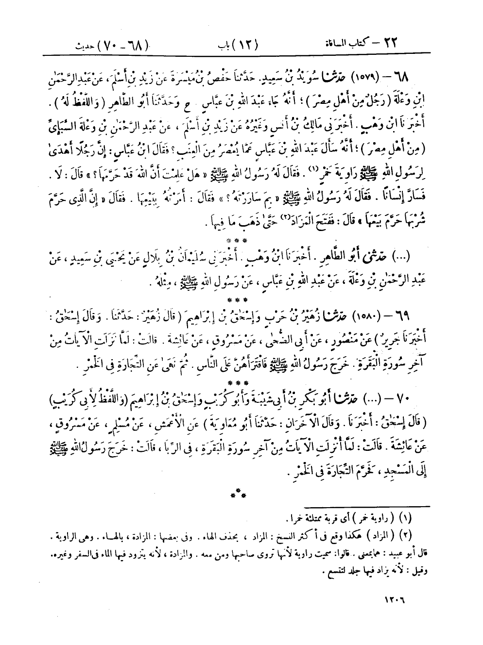 ٦٨ - (١٥٧٩) حَدَّثَنَا سُوَيْدُ بْنُ سَعِيدٍ، حَدَّثَنَا حَفْصُ بْنُ مَيْسَرَةَ، عَنْ زَيْدِ بْنِ أَسْلَمَ، عَنْ عَبْدِ الرَّحْمَنِ بْنِ وَعْلَةَ - رَجُلٌ مِنْ أَهْلِ مِصْرَ - أَنَّهُ جَاءَ عَبْدَ اللهِ بْنَ عَبَّاسٍ، ح وحَدَّثَنَا أَبُو الطَّاهِرِ، وَاللَّفْظُ لَهُ، أَخْبَرَنَا ابْنُ وَهْبٍ، أَخْبَرَنِي مَالِكُ بْنُ أَنَسٍ، وَغَيْرُهُ عَنْ زَيْدِ بْنِ أَسْلَمَ، عَنْ عَبْدِ الرَّحْمَنِ بْنِ وَعْلَةَ السَّبَإِيِّ، مِنْ أَهْلِ مِصْرَ، أَنَّهُ سَأَلَ عَبْدَ اللهِ بْنَ عَبَّاسٍ، عَمَّا يُعْصَرُ مِنَ الْعِنَبِ، فَقَالَ ابْنُ عَبَّاسٍ: إِنَّ رَجُلًا أَهْدَى لِرَسُولِ اللهِ صَلَّى اللهُ عَلَيْهِ وَسَلَّمَ رَاوِيَةَ خَمْرٍ، فَقَالَ لَهُ رَسُولُ اللهِ صَلَّى اللهُ عَلَيْهِ وَسَلَّمَ: «هَلْ عَلِمْتَ أَنَّ اللهَ قَدْ حَرَّمَهَا؟» قَالَ: لَا، فَسَارَّ إِنْسَانًا، فَقَالَ لَهُ رَسُولُ اللهِ صَلَّى اللهُ عَلَيْهِ وَسَلَّمَ: «بِمَ سَارَرْتَهُ؟»، فَقَالَ: أَمَرْتُهُ بِبَيْعِهَا، فَقَالَ: «إِنَّ الَّذِي حَرَّمَ شُرْبَهَا حَرَّمَ بَيْعَهَا»، قَالَ: فَفَتَحَ الْمَزَادَةَ حَتَّى ذَهَبَ مَا فِيهَا،