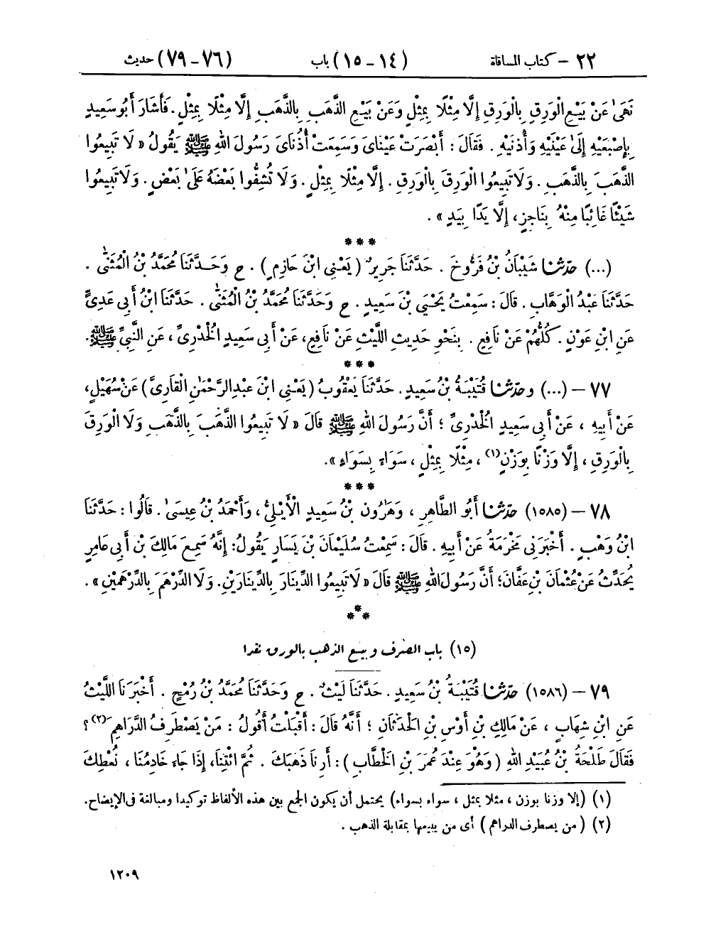 ٧٩ - (١٥٨٦) حَدَّثَنَا قُتَيْبَةُ بْنُ سَعِيدٍ، حَدَّثَنَا لَيْثٌ، ح وحَدَّثَنَا مُحَمَّدُ بْنُ رُمْحٍ، أَخْبَرَنَا اللَّيْثُ، عَنِ ابْنِ شِهَابٍ، عَنْ مَالِكِ بْنِ أَوْسِ بْنِ الْحَدَثَانِ، أَنَّهُ قَالَ: أَقْبَلْتُ أَقُولُ مَنْ يَصْطَرِفُ الدَّرَاهِمَ؟ فَقَالَ طَلْحَةُ بْنُ عُبَيْدِ اللهِ - وَهُوَ عِنْدَ عُمَرَ بْنِ الْخَطَّابِ -: أَرِنَا ذَهَبَكَ، ثُمَّ ائْتِنَا، إِذَا جَاءَ خَادِمُنَا، نُعْطِكَ وَرِقَكَ، فَقَالَ عُمَرُ بْنُ الْخَطَّابِ: كَلَّا، وَاللهِ لَتُعْطِيَنَّهُ وَرِقَهُ، أَوْ لَتَرُدَّنَّ إِلَيْهِ ذَهَبَهُ، فَإِنَّ رَسُولَ اللهِ صَلَّى اللهُ عَلَيْهِ وَسَلَّمَ قَالَ: «الْوَرِقُ بِالذَّهَبِ رِبًا، إِلَّا هَاءَ وَهَاءَ، وَالْبُرُّ بِالْبُرِّ رِبًا، إِلَّا هَاءَ وَهَاءَ، وَالشَّعِيرُ بِالشَّعِيرِ رِبًا، إِلَّا هَاءَ وَهَاءَ، وَالتَّمْرُ بِالتَّمْرِ رِبًا، إِلَّا هَاءَ وَهَاءَ»،