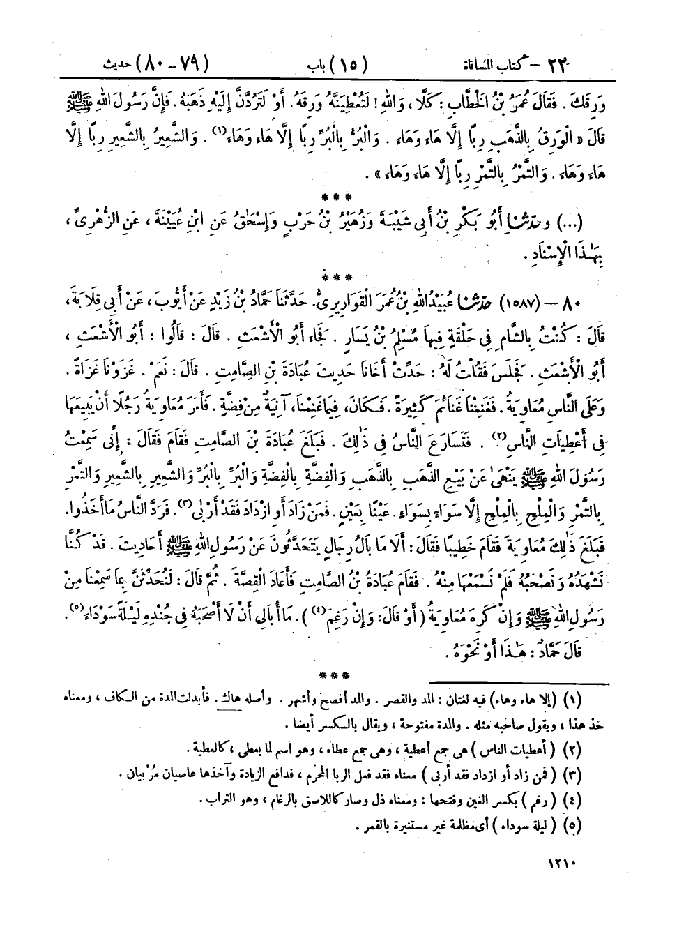٨٠ - (١٥٨٧) حَدَّثَنَا عُبَيْدُ اللهِ بْنُ عُمَرَ الْقَوَارِيرِيُّ، حَدَّثَنَا حَمَّادُ بْنُ زَيْدٍ، عَنْ أَيُّوبَ، عَنْ أَبِي قِلَابَةَ، قَالَ: كُنْتُ بِالشَّامِ فِي حَلْقَةٍ فِيهَا مُسْلِمُ بْنُ يَسَارٍ، فَجَاءَ أَبُو الْأَشْعَثِ، قَالَ: قَالُوا: أَبُو الْأَشْعَثِ، أَبُو الْأَشْعَثِ، فَجَلَسَ، فَقُلْتُ لَهُ: حَدِّثْ أَخَانَا حَدِيثَ عُبَادَةَ بْنِ الصَّامِتِ، قَالَ: نَعَمْ، غَزَوْنَا غَزَاةً وَعَلَى النَّاسِ مُعَاوِيَةُ، فَغَنِمْنَا غَنَائِمَ كَثِيرَةً، فَكَانَ فِيمَا غَنِمْنَا آنِيَةٌ مِنْ فِضَّةٍ، فَأَمَرَ مُعَاوِيَةُ رَجُلًا أَنْ يَبِيعَهَا فِي أَعْطِيَاتِ النَّاسِ، فَتَسَارَعَ النَّاسُ فِي ذَلِكَ، فَبَلَغَ عُبَادَةَ بْنَ الصَّامِتِ، فَقَامَ، فَقَالَ: إِنِّي سَمِعْتُ رَسُولَ اللهِ صَلَّى اللهُ عَلَيْهِ وَسَلَّمَ: «يَنْهَى عَنْ بَيْعِ الذَّهَبِ بِالذَّهَبِ، وَالْفِضَّةِ بِالْفِضَّةِ، وَالْبُرِّ بِالْبُرِّ، وَالشَّعِيرِ بِالشَّعِيرِ، وَالتَّمْرِ بِالتَّمْرِ، وَالْمِلْحِ بِالْمِلْحِ، إِلَّا سَوَاءً بِسَوَاءٍ، عَيْنًا بِعَيْنٍ، فَمَنْ زَادَ، أَوِ ازْدَادَ، فَقَدْ أَرْبَى»، فَرَدَّ النَّاسُ مَا أَخَذُوا، فَبَلَغَ ذَلِكَ مُعَاوِيَةَ فَقَامَ خَطِيبًا، فَقَالَ: أَلَا مَا بَالُ رِجَالٍ يَتَحَدَّثُونَ عَنْ رَسُولِ اللهِ صَلَّى اللهُ عَلَيْهِ وَسَلَّمَ أَحَادِيثَ قَدْ كُنَّا نَشْهَدُهُ وَنَصْحَبُهُ فَلَمْ نَسْمَعْهَا مِنْهُ، فَقَامَ عُبَادَةُ بْنُ الصَّامِتِ فَأَعَادَ الْقِصَّةَ، ثُمَّ قَالَ: " لَنُحَدِّثَنَّ بِمَا سَمِعْنَا مِنْ رَسُولِ اللهِ صَلَّى اللهُ عَلَيْهِ وَسَلَّمَ، وَإِنْ كَرِهَ مُعَاوِيَةُ - أَوْ قَالَ: وَإِنْ رَغِمَ - مَا أُبَالِي أَنْ لَا أَصْحَبَهُ فِي جُنْدِهِ لَيْلَةً سَوْدَاءَ "، قَالَ حَمَّادٌ هَذَا أَوْ نَحْوَهُ،