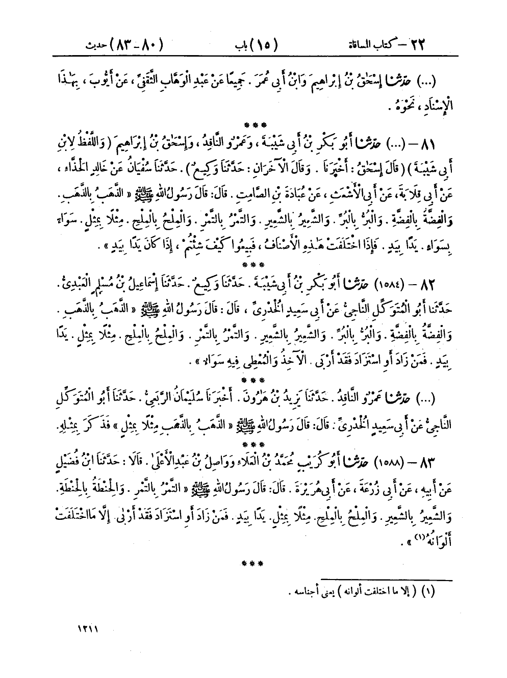 ٨١ - (١٥٨٧) حَدَّثَنَا أَبُو بَكْرِ بْنُ أَبِي شَيْبَةَ، وَعَمْرٌو النَّاقِدُ، وَإِسْحَاقُ بْنُ إِبْرَاهِيمَ، وَاللَّفْظُ لِابْنِ أَبِي شَيْبَةَ، قَالَ إِسْحَاقُ: أَخْبَرَنَا، وَقَالَ الْآخَرَانِ: حَدَّثَنَا وَكِيعٌ، حَدَّثَنَا سُفْيَانُ، عَنْ خَالِدٍ الْحَذَّاءِ، عَنْ أَبِي قِلَابَةَ، عَنْ أَبِي الْأَشْعَثِ، عَنْ عُبَادَةَ بْنِ الصَّامِتِ، قَالَ: قَالَ رَسُولُ اللهِ صَلَّى اللهُ عَلَيْهِ وَسَلَّمَ: «الذَّهَبُ بِالذَّهَبِ، وَالْفِضَّةُ بِالْفِضَّةِ، وَالْبُرُّ بِالْبُرِّ، وَالشَّعِيرُ بِالشَّعِيرِ، وَالتَّمْرُ بِالتَّمْرِ، وَالْمِلْحُ بِالْمِلْحِ، مِثْلًا بِمِثْلٍ، سَوَاءً بِسَوَاءٍ، يَدًا بِيَدٍ، فَإِذَا اخْتَلَفَتْ هَذِهِ الْأَصْنَافُ، فَبِيعُوا كَيْفَ شِئْتُمْ، إِذَا كَانَ يَدًا بِيَدٍ»