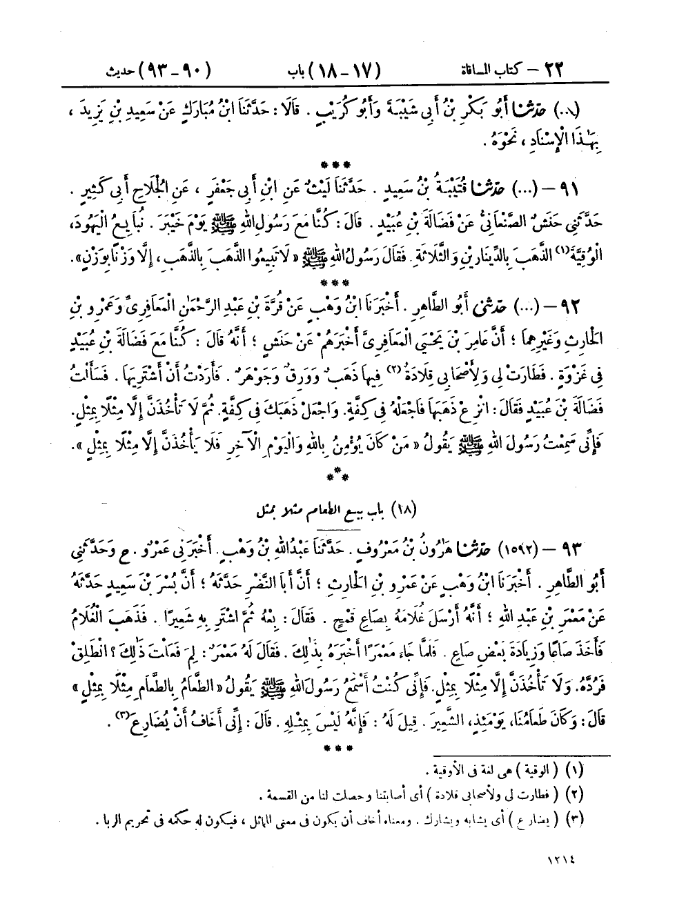 ٩١ - (١٥٩١) حَدَّثَنَا قُتَيْبَةُ بْنُ سَعِيدٍ، حَدَّثَنَا لَيْثٌ، عَنِ ابْنِ أَبِي جَعْفَرٍ، عَنِ الْجُلَاحِ أَبِي كَثِيرٍ، حَدَّثَنِي حَنَشٌ الصَّنْعَانِيُّ، عَنْ فَضَالَةَ بْنِ عُبَيْدٍ، قَالَ: كُنَّا مَعَ رَسُولِ اللهِ صَلَّى اللهُ عَلَيْهِ وَسَلَّمَ يَوْمَ خَيْبَرَ، نُبَايِعُ الْيَهُودَ الْوُقِيَّةَ الذَّهَبَ بِالدِّينَارَيْنِ وَالثَّلَاثَةِ، فَقَالَ رَسُولُ اللهِ صَلَّى اللهُ عَلَيْهِ وَسَلَّمَ: «لَا تَبِيعُوا الذَّهَبَ بِالذَّهَبِ، إِلَّا وَزْنًا بِوَزْنٍ»