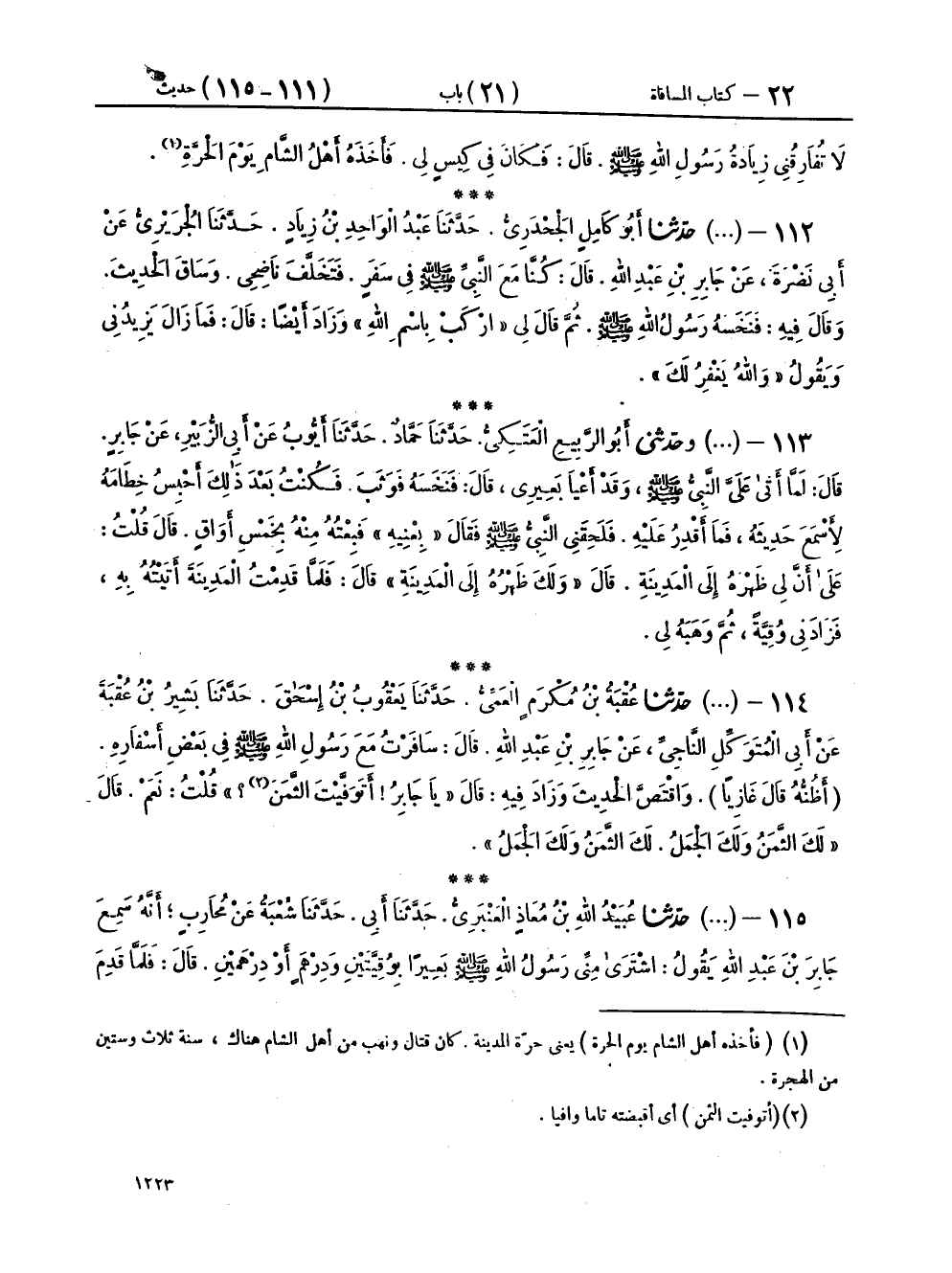 ١١٣ - (٧١٥) وحَدَّثَنِي أَبُو الرَّبِيعِ الْعَتَكِيُّ، حَدَّثَنَا حَمَّادٌ، حَدَّثَنَا أَيُّوبُ، عَنْ أَبِي الزُّبَيْرِ، عَنْ جَابِرٍ، قَالَ: لَمَّا أَتَى عَلَيَّ النَّبِيُّ صَلَّى اللهُ عَلَيْهِ وَسَلَّمَ وَقَدْ أَعْيَا بَعِيرِي، قَالَ: فَنَخَسَهُ، فَوَثَبَ، فَكُنْتُ بَعْدَ ذَلِكَ أَحْبِسُ خِطَامَهُ لِأَسْمَعَ حَدِيثَهُ، فَمَا أَقْدِرُ عَلَيْهِ، فَلَحِقَنِي النَّبِيُّ صَلَّى اللهُ عَلَيْهِ وَسَلَّمَ، فَقَالَ: «بِعْنِيهِ»، فَبِعْتُهُ مِنْهُ بِخَمْسِ أَوَاقٍ، قَالَ: قُلْتُ: عَلَى أَنَّ لِي ظَهْرَهُ إِلَى الْمَدِينَةِ، قَالَ: «وَلَكَ ظَهْرُهُ إِلَى الْمَدِينَةِ»، قَالَ: فَلَمَّا قَدِمْتُ الْمَدِينَةَ أَتَيْتُهُ بِهِ، فَزَادَنِي وُقِيَّةً، ثُمَّ وَهَبَهُ لِي،