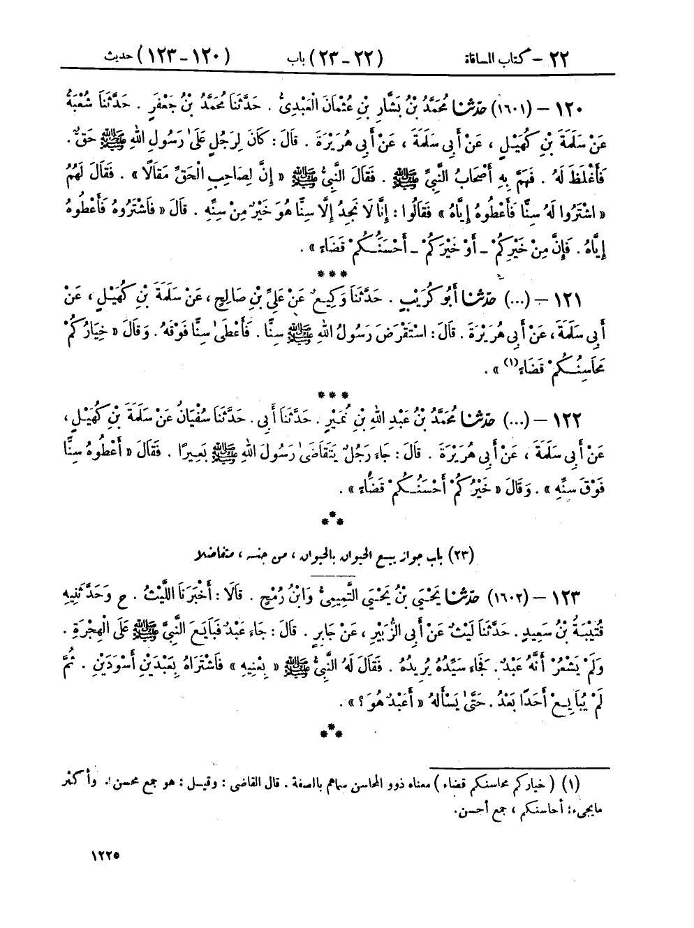 ١٢٢ - (١٦٠١) حَدَّثَنَا مُحَمَّدُ بْنُ عَبْدِ اللهِ بْنِ نُمَيْرٍ، حَدَّثَنَا أَبِي، حَدَّثَنَا سُفْيَانُ، عَنْ سَلَمَةَ بْنِ كُهَيْلٍ، عَنْ أَبِي سَلَمَةَ، عَنْ أَبِي هُرَيْرَةَ، قَالَ: جَاءَ رَجُلٌ يَتَقَاضَى رَسُولَ اللهِ صَلَّى اللهُ عَلَيْهِ وَسَلَّمَ بَعِيرًا، فَقَالَ: " أَعْطُوهُ سِنًّا فَوْقَ سِنِّهِ، وَقَالَ: «خَيْرُكُمْ أَحْسَنُكُمْ قَضَاءً»