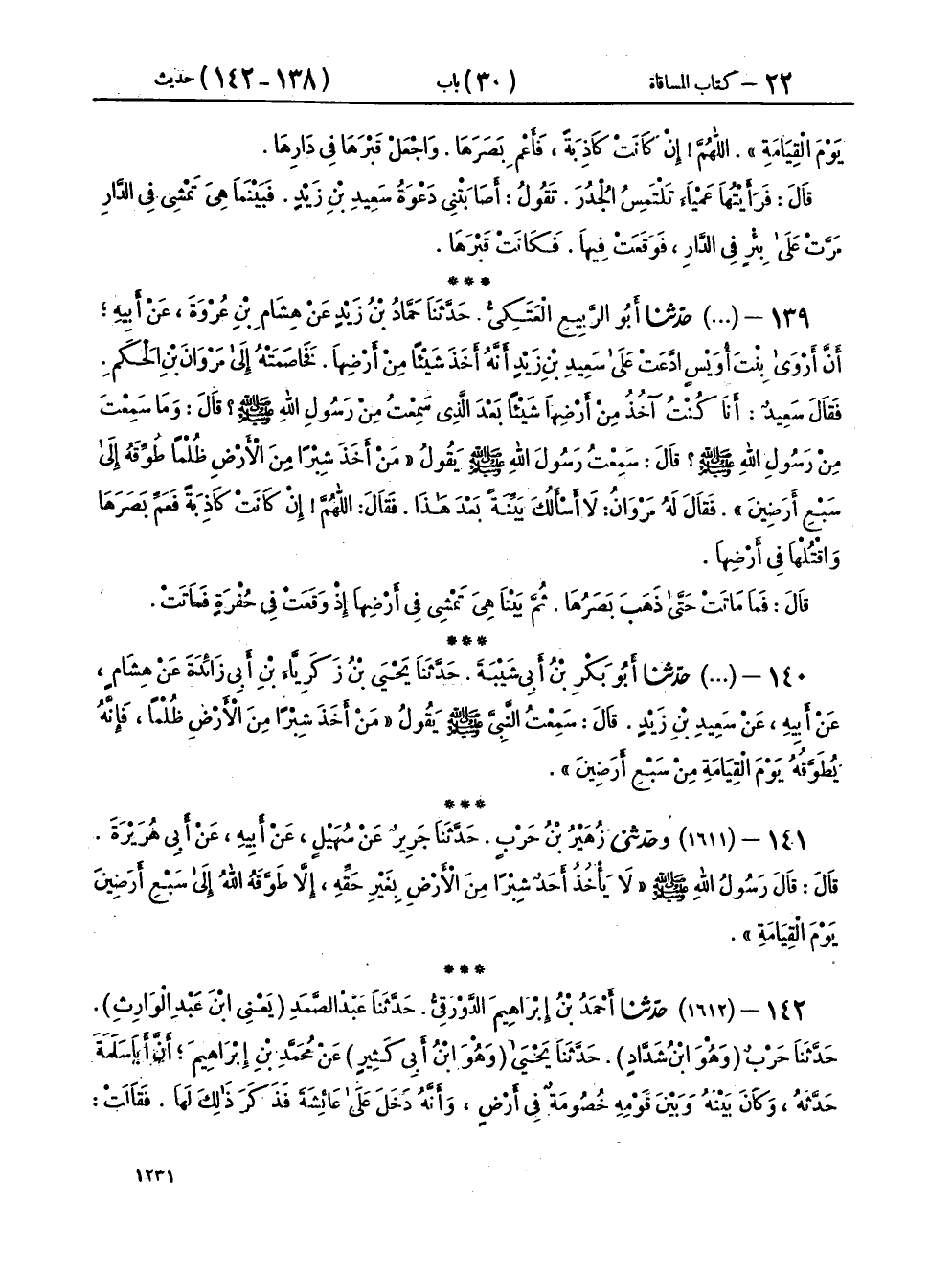 ١٤٠ - (١٦١٠) حَدَّثَنَا أَبُو بَكْرِ بْنُ أَبِي شَيْبَةَ، حَدَّثَنَا يَحْيَى بْنُ زَكَرِيَّا بْنِ أَبِي زَائِدَةَ، عَنْ هِشَامٍ، عَنْ أَبِيهِ، عَنْ سَعِيدِ بْنِ زَيْدٍ، قَالَ: سَمِعْتُ النَّبِيَّ صَلَّى اللهُ عَلَيْهِ وَسَلَّمَ يَقُولُ: «مَنْ أَخَذَ شِبْرًا مِنَ الْأَرْضِ ظُلْمًا، فَإِنَّهُ يُطَوَّقُهُ يَوْمَ الْقِيَامَةِ مِنْ سَبْعِ أَرَضِينَ»