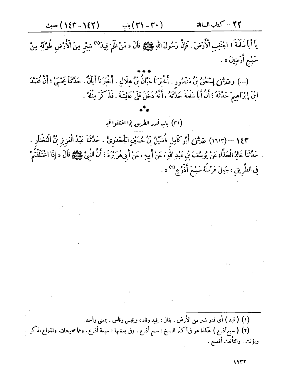 ١٤٣ - (١٦١٣) حَدَّثَنِي أَبُو كَامِلٍ فُضَيْلُ بْنُ حُسَيْنٍ الْجَحْدَرِيُّ، حَدَّثَنَا عَبْدُ الْعَزِيزِ بْنُ الْمُخْتَارِ، حَدَّثَنَا خَالِدٌ الْحَذَّاءُ، عَنْ يُوسُفَ بْنِ عَبْدِ اللهِ، عَنْ أَبِيهِ، عَنْ أَبِي هُرَيْرَةَ، أَنَّ النَّبِيَّ صَلَّى اللهُ عَلَيْهِ وَسَلَّمَ قَالَ: «إِذَا اخْتَلَفْتُمْ فِي الطَّرِيقِ، جُعِلَ عَرْضُهُ سَبْعَ أَذْرُعٍ»