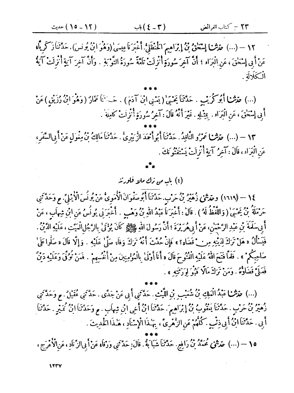 ١٢ - (١٦١٨) حَدَّثَنَا إِسْحَاقُ بْنُ إِبْرَاهِيمَ الْحَنْظَلِيُّ، أَخْبَرَنَا عِيسَى وَهُوَ ابْنُ يُونُسَ، حَدَّثَنَا زَكَرِيَّا، عَنْ أَبِي إِسْحَاقَ، عَنِ الْبَرَاءِ، " أَنَّ آخِرَ سُورَةٍ أُنْزِلَتْ تَامَّةً: سُورَةُ التَّوْبَةِ، وَأَنَّ آخِرَ آيَةٍ أُنْزِلَتْ: آيَةُ الْكَلَالَةِ "،