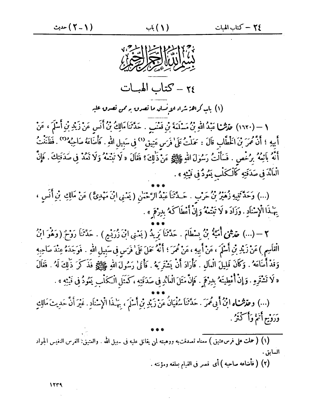 ١ - (١٦٢٠) حَدَّثَنَا عَبْدُ اللهِ بْنُ مَسْلَمَةَ بْنِ قَعْنَبٍ، حَدَّثَنَا مَالِكُ بْنُ أَنَسٍ، عَنْ زَيْدِ بْنِ أَسْلَمَ، عَنْ أَبِيهِ، أَنَّ عُمَرَ بْنَ الْخَطَّابِ، قَالَ: حَمَلْتُ عَلَى فَرَسٍ عَتِيقٍ فِي سَبِيلِ اللهِ، فَأَضَاعَهُ صَاحِبُهُ، فَظَنَنْتُ أَنَّهُ بَائِعُهُ بِرُخْصٍ، فَسَأَلْتُ رَسُولَ اللهِ صَلَّى اللهُ عَلَيْهِ وَسَلَّمَ عَنْ ذَلِكَ، فَقَالَ: «لَا تَبْتَعْهُ، وَلَا تَعُدْ فِي صَدَقَتِكَ، فَإِنَّ الْعَائِدَ فِي صَدَقَتِهِ كَالْكَلْبِ يَعُودُ فِي قَيْئِهِ»،