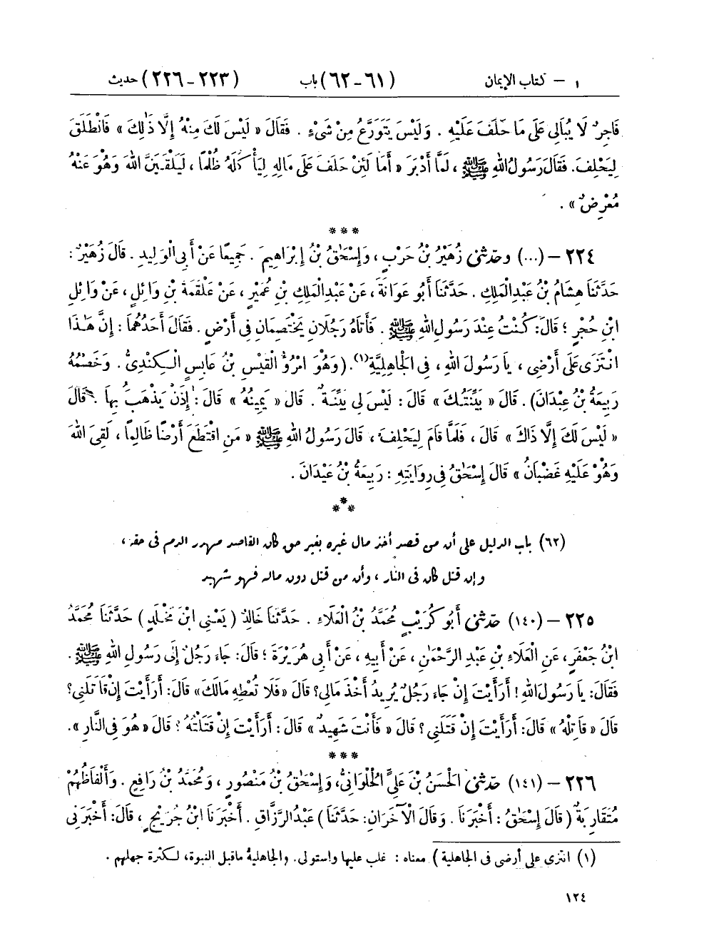 ٢٢٤ - (١٣٩) وَحَدَّثَنِي زُهَيْرُ بْنُ حَرْبٍ، وَإِسْحَاقُ بْنُ إِبْرَاهِيمَ، جَمِيعًا عَنْ أَبِي الْوَلِيدِ، قَالَ زُهَيْرٌ: حَدَّثَنَا هِشَامُ بْنُ عَبْدِ الْمَلِكِ، حَدَّثَنَا أَبُو عَوَانَةَ، عَنْ عَبْدِ الْمَلِكِ بْنِ عُمَيْرٍ، عَنْ عَلْقَمَةَ بْنِ وَائِلٍ، عَنْ وَائِلِ بْنِ حُجْرٍ، قَالَ: كُنْتُ عِنْدَ رَسُولُ اللهِ صَلَّى اللهُ عَلَيْهِ وَسَلَّمَ، فَأَتَاهُ رَجُلَانِ يَخْتَصِمَانِ فِي أَرْضٍ، فَقَالَ أَحَدُهُمَا: إِنَّ هَذَا انْتَزَى عَلَى أَرْضِي يَا رَسُولَ اللهِ فِي الْجَاهِلِيَّةِ - وَهُوَ امْرُؤُ الْقَيْسِ بْنُ عَابِسٍ الْكِنْدِيُّ، وَخَصْمُهُ رَبِيعَةُ بْنُ عِبْدَانَ - قَالَ: «بَيِّنَتُكَ» قَالَ: لَيْسَ لِي بَيِّنَةٌ، قَالَ: «يَمِينُهُ» قَالَ: إِذَنْ يَذْهَبُ بِهَا، قَالَ: «لَيْسَ لَكَ إِلَّا ذَاكَ»، قَالَ: فَلَمَّا قَامَ لِيَحْلِفَ، قَالَ رَسُولُ اللهِ صَلَّى اللهُ عَلَيْهِ وَسَلَّمَ: «مَنِ اقْتَطَعَ أَرْضًا ظَالِمًا، لَقِيَ اللهَ وَهُوَ عَلَيْهِ غَضْبَانُ»، قَالَ إِسْحَاقُ فِي رِوَايَتِهِ: رَبِيعَةُ بْنُ عَيْدَانَ