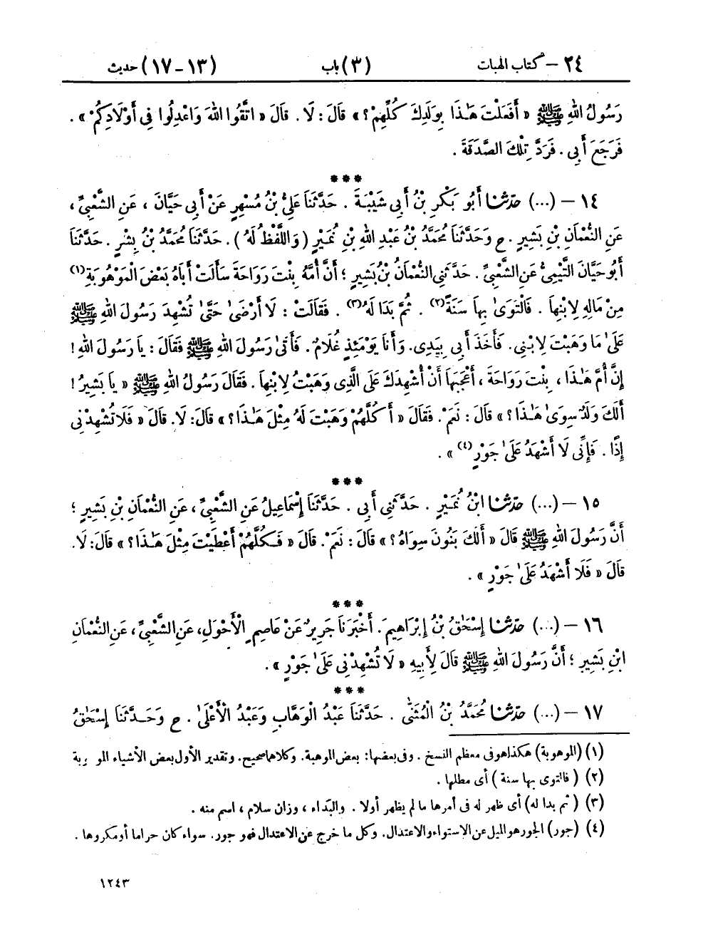 ١٤ - (١٦٢٣) حَدَّثَنَا أَبُو بَكْرِ بْنُ أَبِي شَيْبَةَ، حَدَّثَنَا عَلِيُّ بْنُ مُسْهِرٍ، عَنْ أَبِي حَيَّانَ، عَنِ الشَّعْبِيِّ، عَنِ النُّعْمَانِ بْنِ بَشِيرٍ، ح وحَدَّثَنَا مُحَمَّدُ بْنُ عَبْدِ اللهِ بْنِ نُمَيْرٍ، وَاللَّفْظُ لَهُ، حَدَّثَنَا مُحَمَّدُ بْنُ بِشْرٍ، حَدَّثَنَا أَبُو حَيَّانَ التَّيْمِيُّ، عَنِ الشَّعْبِيِّ، حَدَّثَنِي النُّعْمَانُ بْنُ بَشِيرٍ، أَنَّ أُمَّهُ بِنْتَ رَوَاحَةَ، سَأَلَتْ أَبَاهُ بَعْضَ الْمَوْهِبَةِ مِنْ مَالِهِ لِابْنِهَا، فَالْتَوَى بِهَا سَنَةً ثُمَّ بَدَا لَهُ، فَقَالَتْ: لَا أَرْضَى حَتَّى تُشْهِدَ رَسُولَ اللهِ صَلَّى اللهُ عَلَيْهِ وَسَلَّمَ عَلَى مَا وَهَبْتَ لِابْنِي، فَأَخَذَ أَبِي بِيَدِي وَأَنَا يَوْمَئِذٍ غُلَامٌ، فَأَتَى رَسُولَ اللهِ صَلَّى اللهُ عَلَيْهِ وَسَلَّمَ، فَقَالَ: يَا رَسُولَ اللهِ، إِنَّ أُمَّ هَذَا بِنْتَ رَوَاحَةَ أَعْجَبَهَا أَنْ أُشْهِدَكَ عَلَى الَّذِي وَهَبْتُ لِابْنِهَا، فَقَالَ رَسُولُ اللهِ صَلَّى اللهُ عَلَيْهِ وَسَلَّمَ: «يَا بَشِيرُ أَلَكَ وَلَدٌ سِوَى هَذَا؟» قَالَ: نَعَمْ، فَقَالَ: «أَكُلَّهُمْ وَهَبْتَ لَهُ مِثْلَ هَذَا؟» قَالَ: لَا، قَالَ: «فَلَا تُشْهِدْنِي إِذًا، فَإِنِّي لَا أَشْهَدُ عَلَى جَوْرٍ»