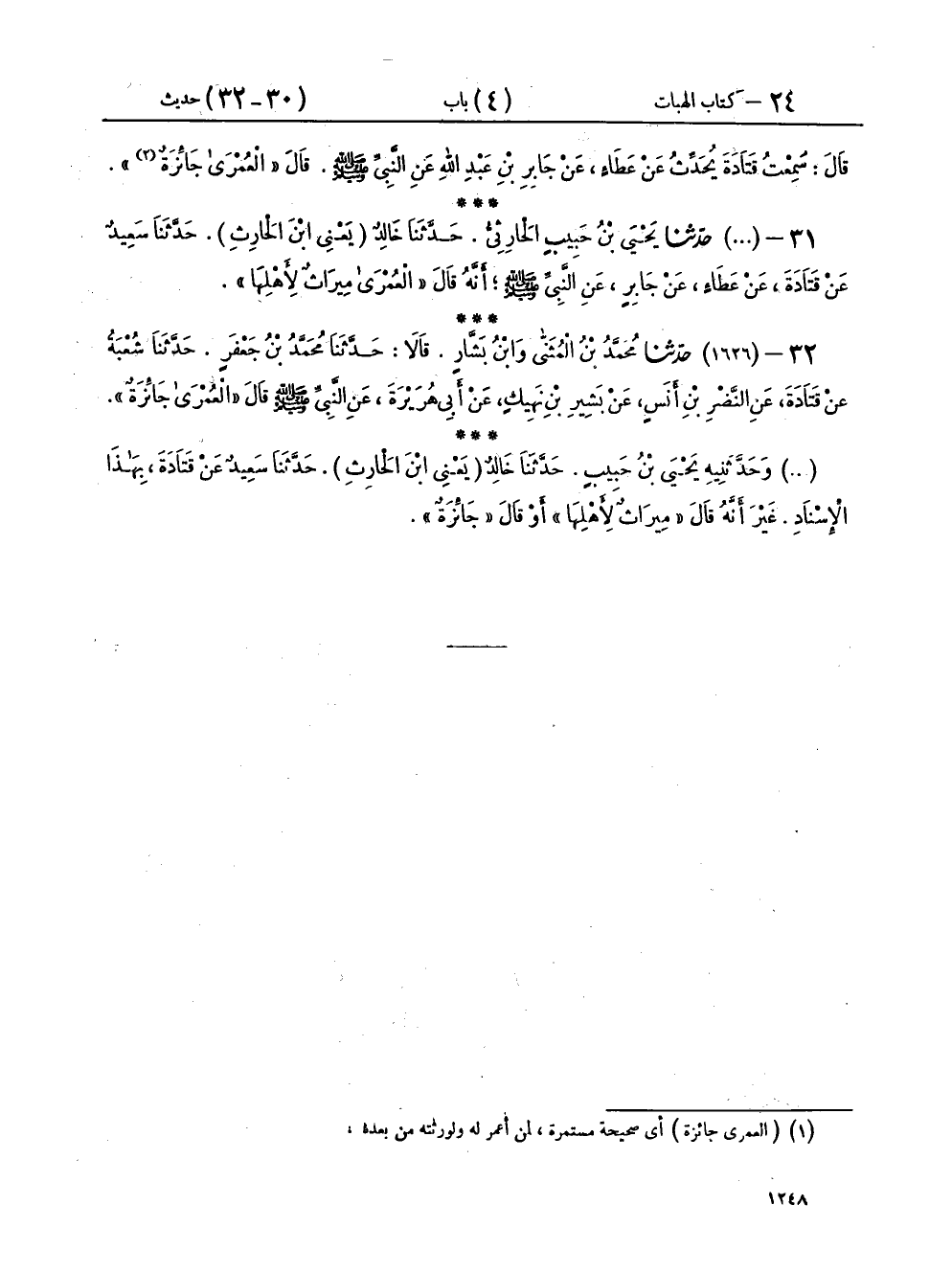 ٣٢ - (١٦٢٦) حَدَّثَنَا مُحَمَّدُ بْنُ الْمُثَنَّى، وَابْنُ بَشَّارٍ، قَالَا: حَدَّثَنَا مُحَمَّدُ بْنُ جَعْفَرٍ، حَدَّثَنَا شُعْبَةُ، عَنْ قَتَادَةَ، عَنِ النَّضْرِ بْنِ أَنَسٍ، عَنْ بَشِيرِ بْنِ نَهِيكٍ، عَنْ أَبِي هُرَيْرَةَ، عَنِ النَّبِيِّ صَلَّى اللهُ عَلَيْهِ وَسَلَّمَ قَالَ: «الْعُمْرَى جَائِزَةٌ»،