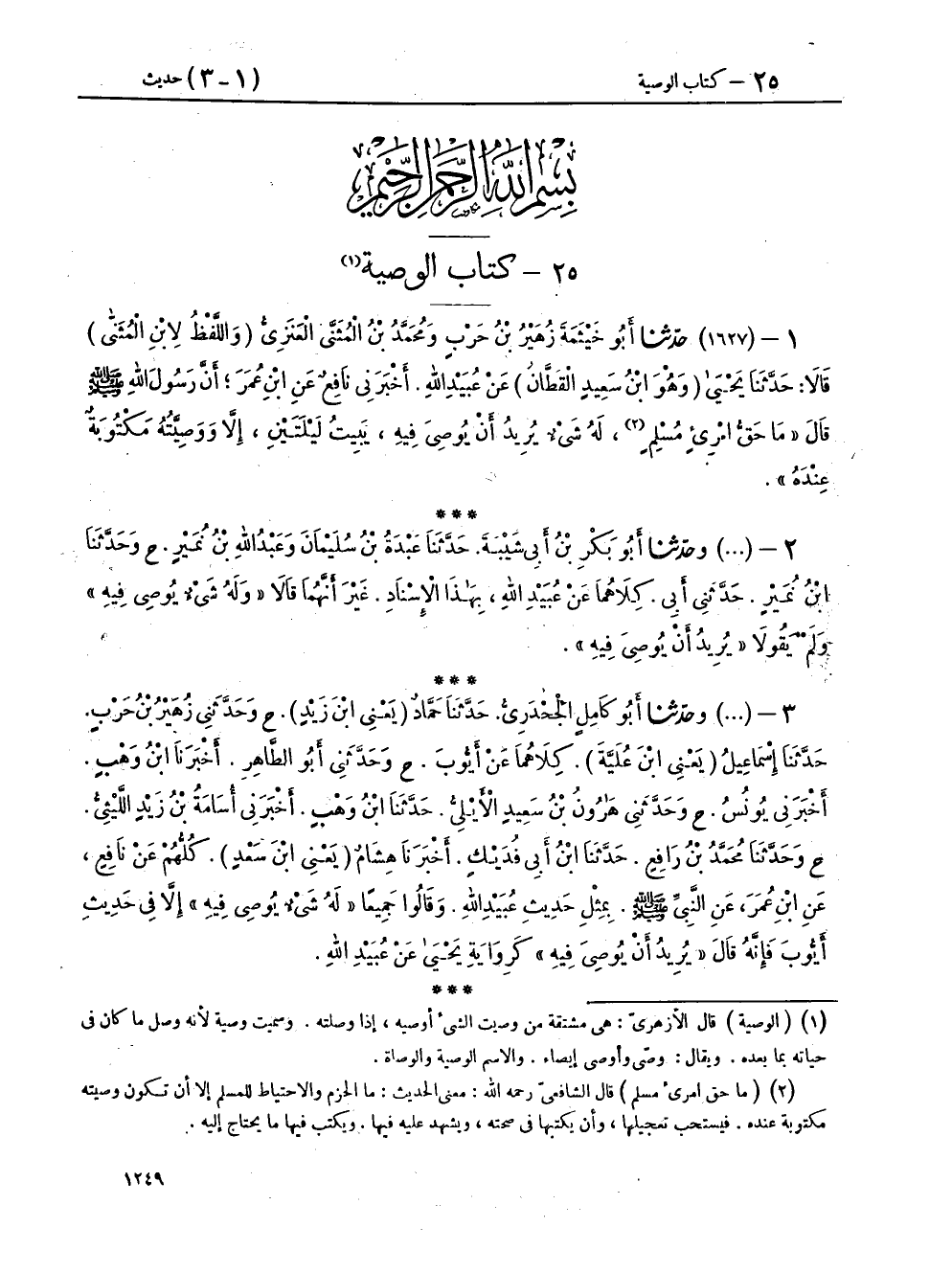 ١ - (١٦٢٧) حَدَّثَنَا أَبُو خَيْثَمَةَ زُهَيْرُ بْنُ حَرْبٍ، وَمُحَمَّدُ بْنُ الْمُثَنَّى الْعَنَزِيُّ، وَاللَّفْظُ لِابْنِ الْمُثَنَّى، قَالَا: حَدَّثَنَا يَحْيَى وَهُوَ ابْنُ سَعِيدٍ الْقَطَّانُ، عَنْ عُبَيْدِ اللهِ، أَخْبَرَنِي نَافِعٌ، عَنِ ابْنِ عُمَرَ، أَنَّ رَسُولَ اللهِ صَلَّى اللهُ عَلَيْهِ وَسَلَّمَ قَالَ: «مَا حَقُّ امْرِئٍ مُسْلِمٍ، لَهُ شَيْءٌ يُرِيدُ أَنْ يُوصِيَ فِيهِ، يَبِيتُ لَيْلَتَيْنِ، إِلَّا وَوَصِيَّتُهُ مَكْتُوبَةٌ عِنْدَهُ»،