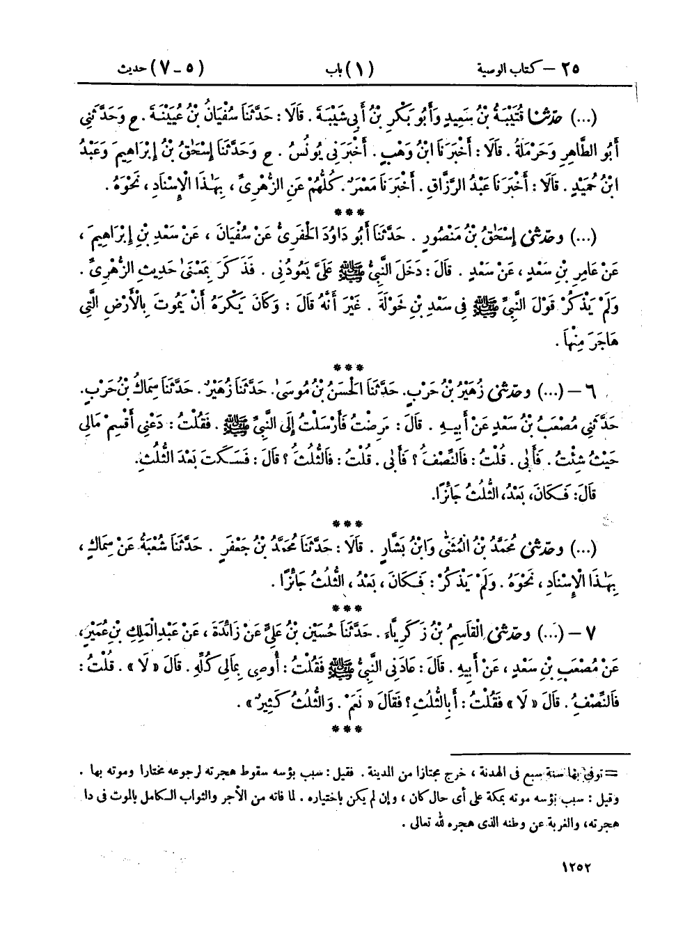 ٧ - (١٦٢٨) وحَدَّثَنِي الْقَاسِمُ بْنُ زَكَرِيَّا، حَدَّثَنَا حُسَيْنُ بْنُ عَلِيٍّ، عَنْ زَائِدَةَ، عَنْ عَبْدِ الْمَلِكِ بْنِ عُمَيْرٍ، عَنْ مُصْعَبِ بْنِ سَعْدٍ، عَنْ أَبِيهِ، قَالَ: عَادَنِي النَّبِيُّ صَلَّى اللهُ عَلَيْهِ وَسَلَّمَ، فَقُلْتُ: أُوصِي بِمَالِي كُلِّهِ؟ قَالَ: «لَا»، قُلْتُ: فَالنِّصْفُ؟ قَالَ: «لَا»، فَقُلْتُ: أَبِالثُّلُثِ؟ فَقَالَ: «نَعَمْ، وَالثُّلُثُ كَثِيرٌ»