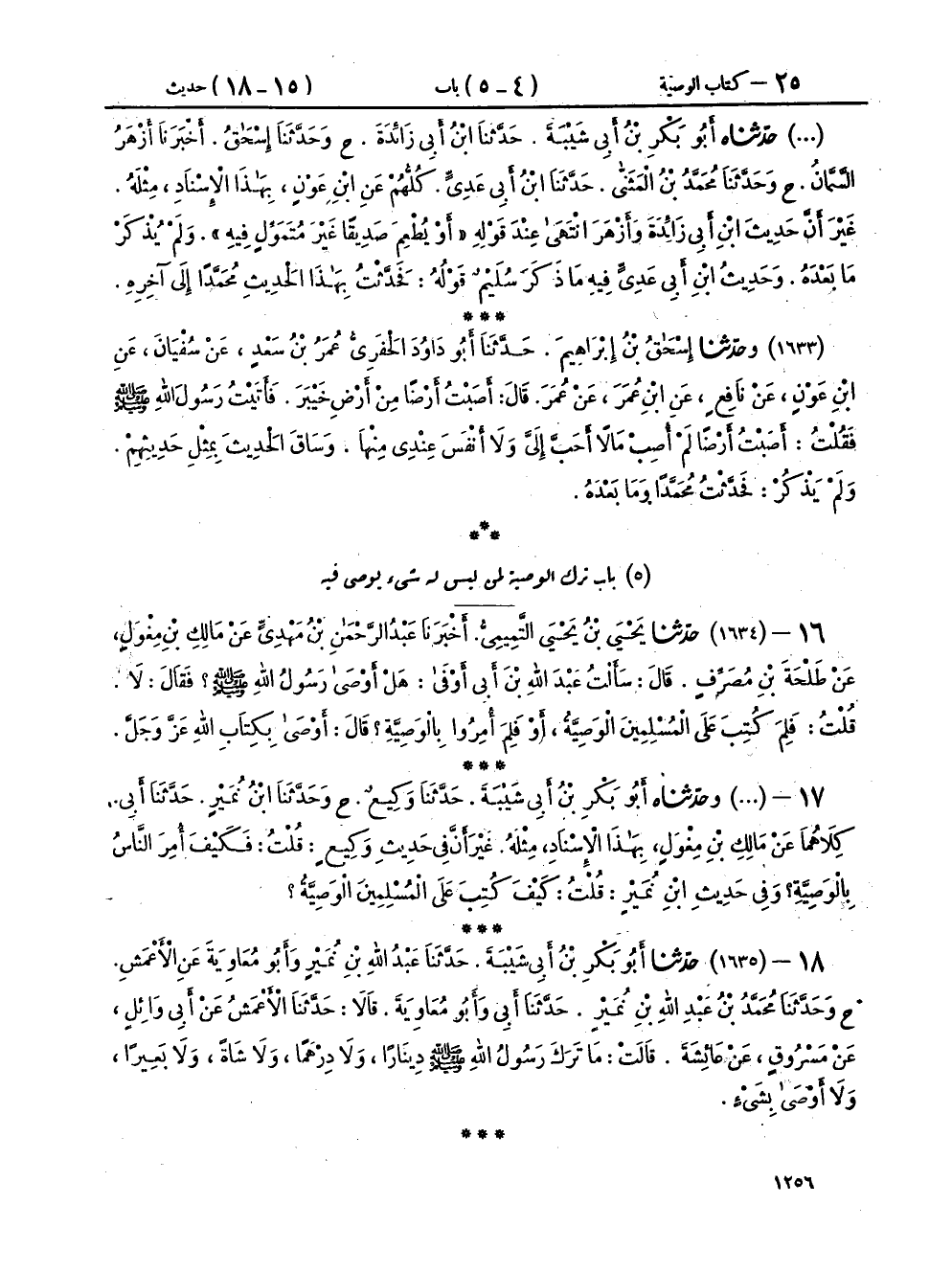 ١٨ - (١٦٣٥) حَدَّثَنَا أَبُو بَكْرِ بْنُ أَبِي شَيْبَةَ، حَدَّثَنَا عَبْدُ اللهِ بْنُ نُمَيْرٍ، وَأَبُو مُعَاوِيَةَ، عَنِ الْأَعْمَشِ، ح وحَدَّثَنَا مُحَمَّدُ بْنُ عَبْدِ اللهِ بْنِ نُمَيْرٍ، حَدَّثَنَا أَبِي، وَأَبُو مُعَاوِيَةَ، قَالَا: حَدَّثَنَا الْأَعْمَشُ، عَنْ أَبِي وَائِلٍ، عَنْ مَسْرُوقٍ، عَنْ عَائِشَةَ، قَالَتْ: «مَا تَرَكَ رَسُولُ اللهِ صَلَّى اللهُ عَلَيْهِ وَسَلَّمَ دِينَارًا، وَلَا دِرْهَمًا، وَلَا شَاةً، وَلَا بَعِيرًا، وَلَا أَوْصَى بِشَيْءٍ»،