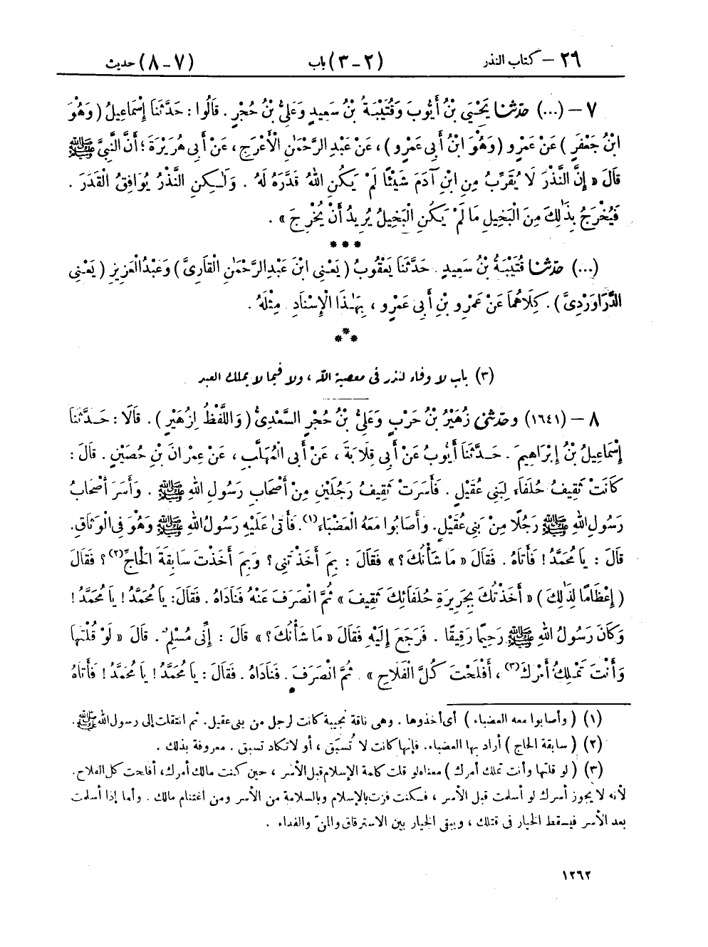 ٨ - (١٦٤١) وحَدَّثَنِي زُهَيْرُ بْنُ حَرْبٍ، وَعَلِيُّ بْنُ حُجْرٍ السَّعْدِيُّ، وَاللَّفْظُ لِزُهَيْرٍ، قَالَا: حَدَّثَنَا إِسْمَاعِيلُ بْنُ إِبْرَاهِيمَ، حَدَّثَنَا أَيُّوبُ، عَنْ أَبِي قِلَابَةَ، عَنْ أَبِي الْمُهَلَّبِ، عَنْ عِمْرَانَ بْنِ حُصَيْنٍ، قَالَ: كَانَتْ ثَقِيفُ حُلَفَاءَ لِبَنِى عُقَيْلٍ، فَأَسَرَتْ ثَقِيفُ رَجُلَيْنِ مِنْ أَصْحَابِ رَسُولِ اللهِ صَلَّى اللهُ عَلَيْهِ وَسَلَّمَ، وَأَسَرَ أَصْحَابُ رَسُولِ اللهِ صَلَّى اللهُ عَلَيْهِ وَسَلَّمَ، رَجُلًا مِنْ بَنِي عُقَيْلٍ، وَأَصَابُوا مَعَهُ الْعَضْبَاءَ، فَأَتَى عَلَيْهِ رَسُولُ اللهِ صَلَّى اللهُ عَلَيْهِ وَسَلَّمَ وَهُوَ فِي الْوَثَاقِ، قَالَ: يَا مُحَمَّدُ، فَأَتَاهُ، فَقَالَ: «مَا شَأْنُكَ؟» فَقَالَ: بِمَ أَخَذْتَنِي، وَبِمَ أَخَذْتَ سَابِقَةَ الْحَاجِّ؟ فَقَالَ: «إِعْظَامًا لِذَلِكَ أَخَذْتُكَ بِجَرِيرَةِ حُلَفَائِكَ ثَقِيفَ»، ثُمَّ انْصَرَفَ عَنْهُ، فَنَادَاهُ، فَقَالَ: يَا مُحَمَّدُ، يَا مُحَمَّدُ، وَكَانَ رَسُولُ اللهِ صَلَّى اللهُ عَلَيْهِ وَسَلَّمَ رَحِيمًا رَقِيقًا، فَرَجَعَ إِلَيْهِ، فَقَالَ: «مَا شَأْنُكَ؟» قَالَ: إِنِّي مُسْلِمٌ، قَالَ: «لَوْ قُلْتَهَا وَأَنْتَ تَمْلِكُ أَمْرَكَ أَفْلَحْتَ كُلَّ الْفَلَاحِ»، ثُمَّ انْصَرَفَ، فَنَادَاهُ، فَقَالَ: يَا مُحَمَّدُ، يَا مُحَمَّدُ، فَأَتَاهُ، فَقَالَ: «مَا شَأْنُكَ؟» قَالَ: إِنِّي جَائِعٌ فَأَطْعِمْنِي، وَظَمْآنُ فَأَسْقِنِي، قَالَ: «هَذِهِ حَاجَتُكَ»، فَفُدِيَ بِالرَّجُلَيْنِ، قَالَ: وَأُسِرَتِ امْرَأَةٌ مِنَ الْأَنْصَارِ وَأُصِيبَتِ الْعَضْبَاءُ، فَكَانَتِ الْمَرْأَةُ فِي الْوَثَاقِ وَكَانَ الْقَوْمُ يُرِيحُونَ نَعَمَهُمْ بَيْنَ يَدَيْ بُيُوتِهِمْ، فَانْفَلَتَتْ ذَاتَ لَيْلَةٍ مِنَ الْوَثَاقِ، فَأَتَتِ الْإِبِلَ، فَجَعَلَتْ إِذَا دَنَتْ مِنَ الْبَعِيرِ رَغَا فَتَتْرُكُهُ حَتَّى تَنْتَهِيَ إِلَى الْعَضْبَاءِ، فَلَمْ تَرْغُ، قَالَ: وَنَاقَةٌ مُنَوَّقَةٌ فَقَعَدَتْ فِي عَجُزِهَا، ثُمَّ زَجَرَتْهَا فَانْطَلَقَتْ، وَنَذِرُوا بِهَا فَطَلَبُوهَا فَأَعْجَزَتْهُمْ، قَالَ: وَنَذَرَتْ لِلَّهِ إِنْ نَجَّاهَا اللهُ عَلَيْهَا لَتَنْحَرَنَّهَا، فَلَمَّا قَدِمَتِ الْمَدِينَةَ رَآهَا النَّاسُ، فَقَالُوا: الْعَضْبَاءُ نَاقَةُ رَسُولِ اللهِ صَلَّى اللهُ عَلَيْهِ وَسَلَّمَ، فَقَالَتْ: إِنَّهَا نَذَرَتْ إِنْ نَجَّاهَا اللهُ عَلَيْهَا لَتَنْحَرَنَّهَا، فَأَتَوْا رَسُولَ اللهِ صَلَّى اللهُ عَلَيْهِ وَسَلَّمَ، فَذَكَرُوا ذَلِكَ لَهُ، فَقَالَ: «سُبْحَانَ اللهِ، بِئْسَمَا جَزَتْهَا، نَذَرَتْ لِلَّهِ إِنْ نَجَّاهَا اللهُ عَلَيْهَا لَتَنْحَرَنَّهَا، لَا وَفَاءَ لِنَذْرٍ فِي مَعْصِيَةٍ، وَلَا فِيمَا لَا يَمْلِكُ الْعَبْدُ»، وَفِي رِوَايَةِ ابْنِ حُجْرٍ: «لَا نَذْرَ فِي مَعْصِيَةِ اللهِ»،