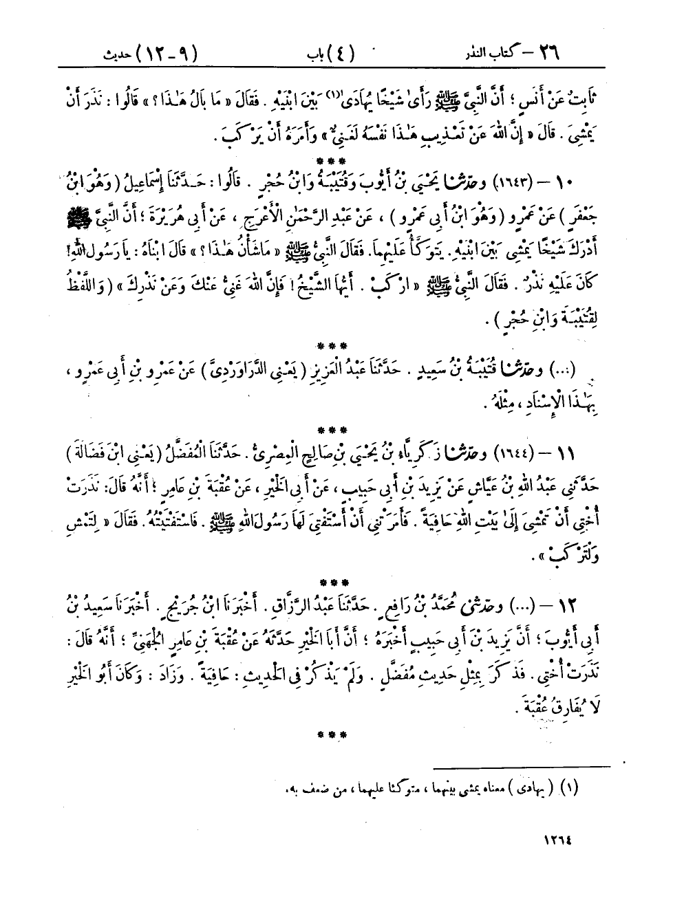 ١٠ - (١٦٤٣) وحَدَّثَنَا يَحْيَى بْنُ أَيُّوبَ، وَقُتَيْبَةُ، وَابْنُ حُجْرٍ، قَالُوا: حَدَّثَنَا إِسْمَاعِيلُ وَهُوَ ابْنُ جَعْفَرٍ، عَنْ عَمْرٍو وَهُوَ ابْنُ أَبِي عَمْرٍو، عَنْ عَبْدِ الرَّحْمَنِ الْأَعْرَجِ، عَنْ أَبِي هُرَيْرَةَ، أَنَّ النَّبِيَّ صَلَّى اللهُ عَلَيْهِ وَسَلَّمَ أَدْرَكَ شَيْخًا يَمْشِي بَيْنَ ابْنَيْهِ، يَتَوَكَّأُ عَلَيْهِمَا، فَقَالَ النَّبِيُّ صَلَّى اللهُ عَلَيْهِ وَسَلَّمَ: «مَا شَأْنُ هَذَا؟» قَالَ ابْنَاهُ: يَا رَسُولَ اللهِ، كَانَ عَلَيْهِ نَذْرٌ، فَقَالَ النَّبِيُّ صَلَّى اللهُ عَلَيْهِ وَسَلَّمَ: «ارْكَبْ أَيُّهَا الشَّيْخُ، فَإِنَّ اللهَ غَنِيٌّ عَنْكَ، وَعَنْ نَذْرِكَ»، وَاللَّفْظُ لِقُتَيْبَةَ، وَابْنِ حُجْرٍ،