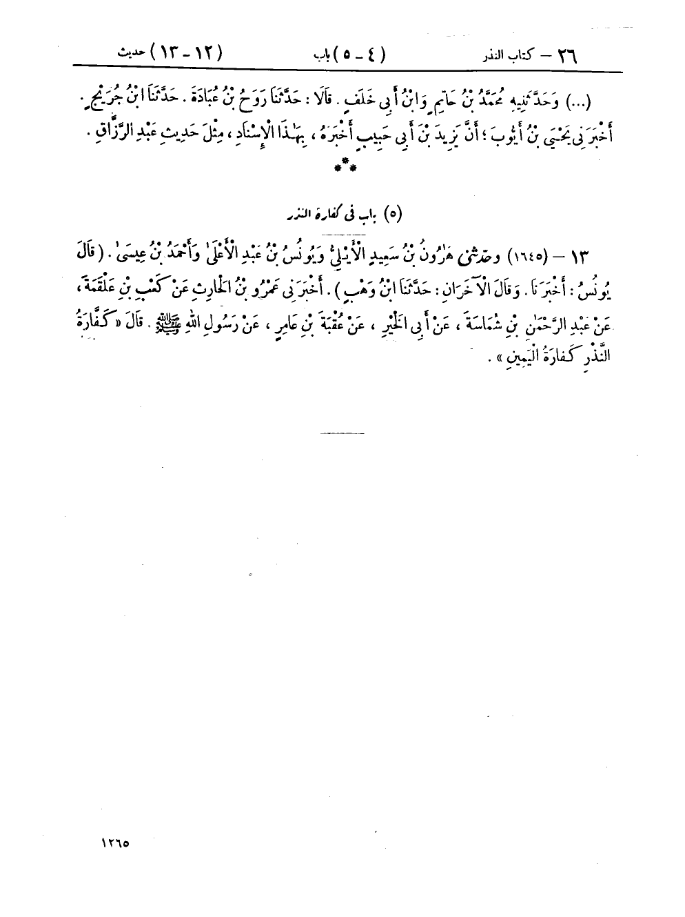 ١٣ - (١٦٤٥) وحَدَّثَنِي هَارُونُ بْنُ سَعِيدٍ الْأَيْلِيُّ، وَيُونُسُ بْنُ عَبْدِ الْأَعْلَى، وَأَحْمَدُ بْنُ عِيسَى، قَالَ يُونُسُ: أَخْبَرَنَا، وقَالَ الْآخَرَانِ: حَدَّثَنَا ابْنُ وَهْبٍ، أَخْبَرَنِي عَمْرُو بْنُ الْحَارِثِ، عَنْ كَعْبِ بْنِ عَلْقَمَةَ، عَنْ عَبْدِ الرَّحْمَنِ بْنِ شِمَاسَةَ، عَنْ أَبِي الْخَيْرِ، عَنْ عُقْبَةَ بْنِ عَامِرٍ، عَنْ رَسُولِ اللهِ صَلَّى اللهُ عَلَيْهِ وَسَلَّمَ قَالَ: «كَفَّارَةُ النَّذْرِ كَفَّارَةُ الْيَمِينِ»