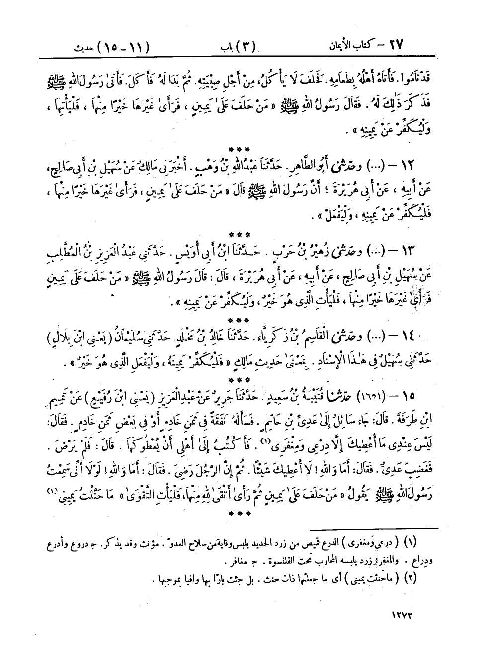١٥ - (١٦٥١) حَدَّثَنَا قُتَيْبَةُ بْنُ سَعِيدٍ، حَدَّثَنَا جَرِيرٌ، عَنْ عَبْدِ الْعَزِيزِ يَعْنِي ابْنَ رُفَيْعٍ، عَنْ تَمِيمِ بْنِ طَرَفَةَ، قَالَ: جَاءَ سَائِلٌ إِلَى عَدِيِّ بْنِ حَاتِمٍ، فَسَأَلَهُ نَفَقَةً فِي ثَمَنِ خَادِمٍ - أَوْ فِي بَعْضِ ثَمَنِ خَادِمٍ - فَقَالَ: لَيْسَ عِنْدِي مَا أُعْطِيكَ إِلَّا دِرْعِي، وَمِغْفَرِي، فَأَكْتُبُ إِلَى أَهْلِي أَنْ يُعْطُوكَهَا، قَالَ: فَلَمْ يَرْضَ، فَغَضِبَ عَدِيٌّ، فَقَالَ: أَمَا وَاللهِ لَا أُعْطِيكَ شَيْئًا، ثُمَّ إِنَّ الرَّجُلَ رَضِيَ، فَقَالَ: أَمَا وَاللهِ لَوْلَا أَنِّي سَمِعْتُ رَسُولَ اللهِ صَلَّى اللهُ عَلَيْهِ وَسَلَّمَ، يَقُولُ: «مَنْ حَلَفَ عَلَى يَمِينٍ، ثُمَّ رَأَى أَتْقَى لِلَّهِ مِنْهَا، فَلْيَأْتِ التَّقْوَى» مَا حَنَّثْتُ يَمِينِي