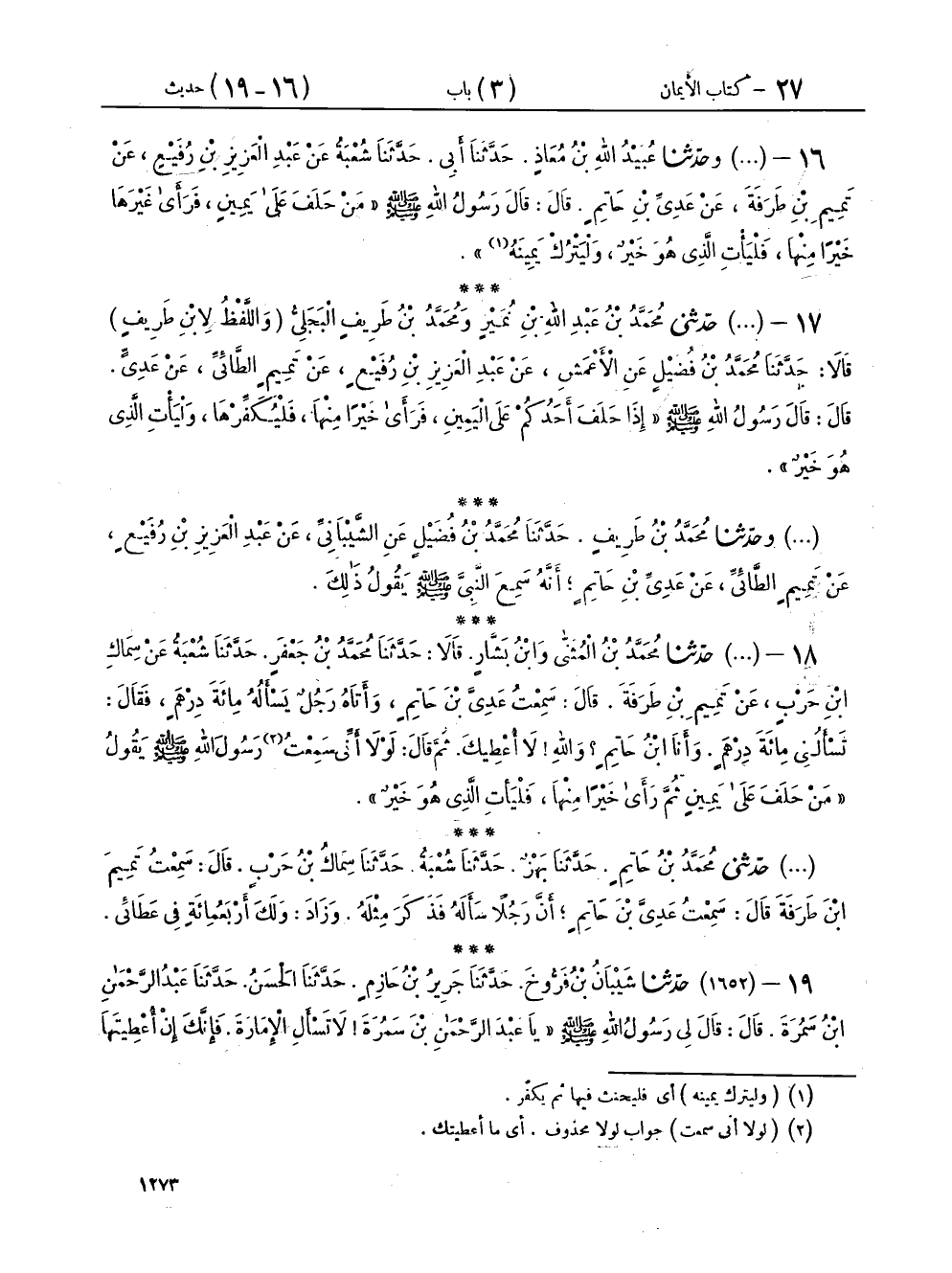 ١٨ - (١٦٥١) حَدَّثَنَا مُحَمَّدُ بْنُ الْمُثَنَّى، وَابْنُ بَشَّارٍ، قَالَا: حَدَّثَنَا مُحَمَّدُ بْنُ جَعْفَرٍ، حَدَّثَنَا شُعْبَةُ، عَنْ سِمَاكِ بْنِ حَرْبٍ، عَنْ تَمِيمِ بْنِ طَرَفَةَ، قَالَ: سَمِعْتُ عَدِيَّ بْنَ حَاتِمٍ، وَأَتَاهُ رَجُلٌ يَسْأَلُهُ مِائَةَ دِرْهَمٍ، فَقَالَ: تَسْأَلُنِي مِائَةَ دِرْهَمٍ، وَأَنَا ابْنُ حَاتِمٍ، وَاللهِ لَا أُعْطِيكَ، ثُمَّ قَالَ: لَوْلَا أَنِّي سَمِعْتُ رَسُولَ اللهِ صَلَّى اللهُ عَلَيْهِ وَسَلَّمَ، يَقُولُ: «مَنْ حَلَفَ عَلَى يَمِينٍ، ثُمَّ رَأَى خَيْرًا مِنْهَا، فَلْيَأْتِ الَّذِي هُوَ خَيْرٌ»،