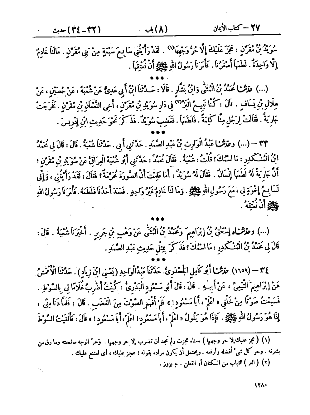 ٣٣ - (١٦٥٨) وحَدَّثَنَا عَبْدُ الْوَارِثِ بْنُ عَبْدِ الصَّمَدِ، حَدَّثَنِي أَبِي، حَدَّثَنَا شُعْبَةُ، قَالَ: قَالَ لِي مُحَمَّدُ بْنُ الْمُنْكَدِرِ: مَا اسْمُكَ؟ قُلْتُ شُعْبَةُ: فَقَالَ: مُحَمَّدٌ: حَدَّثَنِي أَبُو شُعْبَةَ الْعِرَاقِيُّ، عَنْ سُوَيْدِ بْنِ مُقَرِّنٍ، أَنَّ جَارِيَةً لَهُ لَطَمَهَا إِنْسَانٌ، فَقَالَ لَهُ سُوَيْدٌ: أَمَا عَلِمْتَ أَنَّ الصُّورَةَ مُحَرَّمَةٌ، فَقَالَ: «لَقَدْ رَأَيْتُنِي وَإِنِّي لَسَابِعُ إِخْوَةٍ لِي مَعَ رَسُولِ اللهِ صَلَّى اللهُ عَلَيْهِ وَسَلَّمَ، وَمَا لَنَا خَادِمٌ غَيْرُ وَاحِدٍ، فَعَمَدَ أَحَدُنَا فَلَطَمَهُ، فَأَمَرَنَا رَسُولُ اللهِ صَلَّى اللهُ عَلَيْهِ وَسَلَّمَ أَنْ نُعْتِقَهُ»،