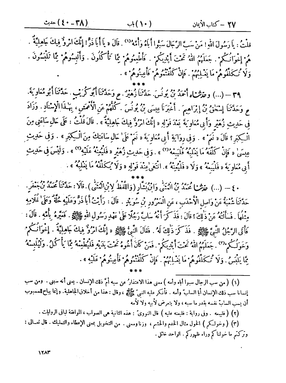 ٣٩ - (١٦٦١) وَحَدَّثَنَاهُ أَحْمَدُ بْنُ يُونُسَ، حَدَّثَنَا زُهَيْرٌ، ح وحَدَّثَنَا أَبُو كُرَيْبٍ، حَدَّثَنَا أَبُو مُعَاوِيَةَ، ح وحَدَّثَنَا إِسْحَاقُ بْنُ إِبْرَاهِيمَ، أَخْبَرَنَا عِيسَى بْنُ يُونُسَ، كُلُّهُمْ عَنِ الْأَعْمَشِ، بِهَذَا الْإِسْنَادِ، وَزَادَ فِي حَدِيثِ زُهَيْرٍ، وَأَبِي مُعَاوِيَةَ بَعْدَ قَوْلِهِ: «إِنَّكَ امْرُؤٌ فِيكَ جَاهِلِيَّةٌ»، قَالَ: قُلْتُ: عَلَى حَالِ سَاعَتِي مِنَ الْكِبَرِ؟ قَالَ: «نَعَمْ»، وَفِي رِوَايَةِ أَبِي مُعَاوِيَةَ: «نَعَمْ عَلَى حَالِ سَاعَتِكَ مِنَ الْكِبَرِ»، وَفِي حَدِيثِ عِيسَى: «فَإِنْ كَلَّفَهُ مَا يَغْلِبُهُ فَلْيَبِعْهُ»، وَفِي حَدِيثِ زُهَيْرٍ: «فَلْيُعِنْهُ عَلَيْهِ»، وَلَيْسَ فِي حَدِيثِ أَبِي مُعَاوِيَةَ: «فَلْيَبِعْهُ»، وَلَا «فَلْيُعِنْهُ»، انْتَهَى عِنْدَ قَوْلِهِ: «وَلَا يُكَلِّفْهُ مَا يَغْلِبُهُ»