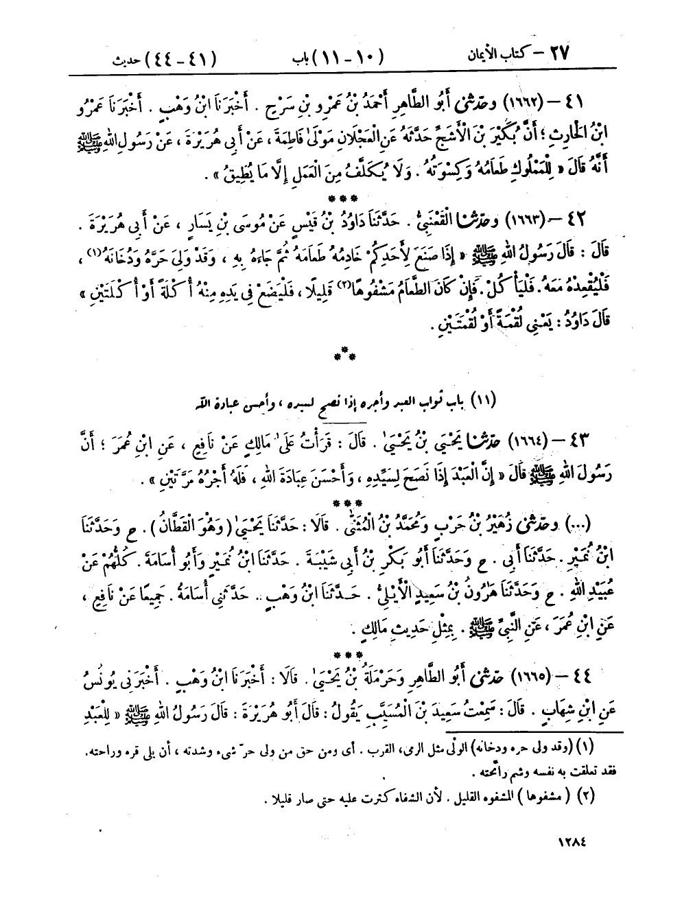 ٤٤ - (١٦٦٥) حَدَّثَنِي أَبُو الطَّاهِرِ، وَحَرْمَلَةُ بْنُ يَحْيَى، قَالَا: أَخْبَرَنَا ابْنُ وَهْبٍ، أَخْبَرَنِي يُونُسُ، عَنِ ابْنِ شِهَابٍ، قَالَ: سَمِعْتُ سَعِيدَ بْنَ الْمُسَيِّبِ، يَقُولُ: قَالَ أَبُو هُرَيْرَةَ: قَالَ رَسُولُ اللهِ صَلَّى اللهُ عَلَيْهِ وَسَلَّمَ: «لِلْعَبْدِ الْمَمْلُوكِ الْمُصْلِحِ أَجْرَانِ»، وَالَّذِي نَفْسُ أَبِي هُرَيْرَةَ بِيَدِهِ، لَوْلَا الْجِهَادُ فِي سَبِيلِ اللهِ، وَالْحَجُّ، وَبِرُّ أُمِّي، لَأَحْبَبْتُ أَنْ أَمُوتَ وَأَنَا مَمْلُوكٌ "، قَالَ: وَبَلَغَنَا أَنَّ أَبَا هُرَيْرَةَ لَمْ يَكُنْ يَحُجُّ حَتَّى مَاتَتْ أُمُّهُ لِصُحْبَتِهَا، قَالَ أَبُو الطَّاهِرِ فِي حَدِيثِهِ: «لِلْعَبْدِ الْمُصْلِحِ»، وَلَمْ يَذْكُرْ «الْمَمْلُوكَ»،