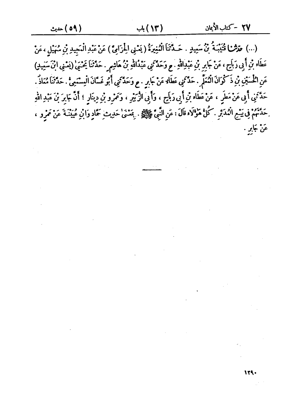 (٩٩٧) - حَدَّثَنَا قُتَيْبَةُ بْنُ سَعِيدٍ، حَدَّثَنَا الْمُغِيرَةُ يَعْنِي الْحِزَامِيَّ، عَنْ عَبْدِ الْمَجِيدِ بْنِ سُهَيْلٍ، عَنْ عَطَاءِ بْنِ أَبِي رَبَاحٍ، عَنْ جَابِرِ بْنِ عَبْدِ اللهِ، ح وحَدَّثَنِي عَبْدُ اللهِ بْنُ هَاشِمٍ، حَدَّثَنَا يَحْيَى يَعْنِي ابْنَ سَعِيدٍ، عَنِ الْحُسَيْنِ بْنِ ذَكْوَانَ الْمُعَلِّمِ، حَدَّثَنِي عَطَاءٌ، عَنْ جَابِرٍ، ح وحَدَّثَنِي أَبُو غَسَّانَ الْمِسْمَعِيُّ، حَدَّثَنَا مُعَاذٌ، حَدَّثَنِي أَبِي، عَنْ مَطَرٍ، عَنْ عَطَاءِ بْنِ أَبِي رَبَاحٍ، وَأَبِي الزُّبَيْرِ، وَعَمْرِو بْنِ دِينَارٍ، أَنَّ جَابِرَ بْنَ عَبْدِ اللهِ، حَدَّثَهُمْ فِي بَيْعِ الْمُدَبَّرِ كُلُّ هَؤُلَاءِ، قَالَ: عَنِ النَّبِيِّ صَلَّى اللهُ عَلَيْهِ وَسَلَّمَ بِمَعْنَى حَدِيثِ حَمَّادٍ، وَابْنِ عُيَيْنَةَ، عَنْ عَمْرٍو، عَنْ جَابِرٍ