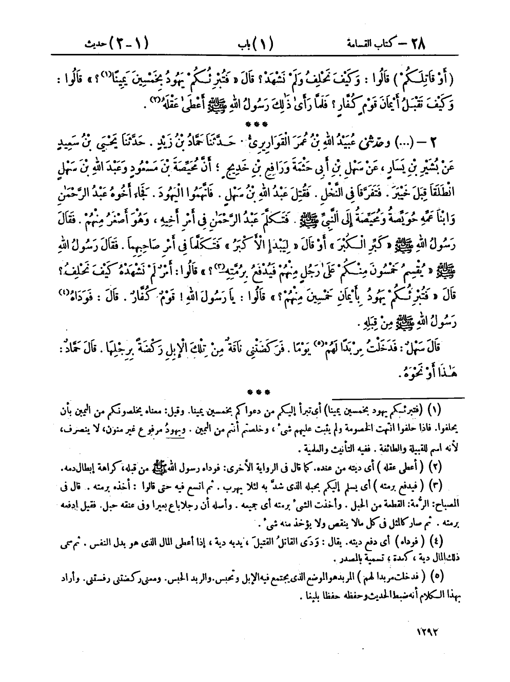 ٢ - (١٦٦٩) وحَدَّثَنِي عُبَيْدُ اللهِ بْنُ عُمَرَ الْقَوَارِيرِيُّ، حَدَّثَنَا حَمَّادُ بْنُ زَيْدٍ، حَدَّثَنَا يَحْيَى بْنُ سَعِيدٍ، عَنْ بُشَيْرِ بْنِ يَسَارٍ، عَنْ سَهْلِ بْنِ أَبِي حَثْمَةَ، وَرَافِعِ بْنِ خَدِيجٍ، أَنَّ مُحَيِّصَةَ بْنَ مَسْعُودٍ، وَعَبْدَ اللهِ بْنَ سَهْلٍ، انْطَلَقَا قِبَلَ خَيْبَرَ، فَتَفَرَّقَا فِي النَّخْلِ، فَقُتِلَ عَبْدُ اللهِ بْنُ سَهْلٍ، فَاتَّهَمُوا الْيَهُودَ، فَجَاءَ أَخُوهُ عَبْدُ الرَّحْمَنِ، وَابْنَا عَمِّهِ حُوَيِّصَةُ، وَمُحَيِّصَةُ إِلَى النَّبِيِّ صَلَّى اللهُ عَلَيْهِ وَسَلَّمَ، فَتَكَلَّمَ عَبْدُ الرَّحْمَنِ فِي أَمْرِ أَخِيهِ، وَهُوَ أَصْغَرُ مِنْهُمْ، فَقَالَ رَسُولُ اللهِ صَلَّى اللهُ عَلَيْهِ وَسَلَّمَ: «كَبِّرِ الْكُبْرَ»، أَوْ قَالَ: «لِيَبْدَأِ الْأَكْبَرُ»، فَتَكَلَّمَا فِي أَمْرِ صَاحِبِهِمَا، فَقَالَ رَسُولُ اللهِ صَلَّى اللهُ عَلَيْهِ وَسَلَّمَ: «يَقْسِمُ خَمْسُونَ مِنْكُمْ عَلَى رَجُلٍ مِنْهُمْ، فَيُدْفَعُ بِرُمَّتِهِ»، قَالُوا: أَمْرٌ لَمْ نَشْهَدْهُ، كَيْفَ نَحْلِفُ؟ قَالَ: «فَتُبْرِئُكُمْ يَهُودُ بِأَيْمَانِ خَمْسِينَ مِنْهُمْ»، قَالُوا: يَا رَسُولَ اللهِ، قَوْمٌ كُفَّارٌ؟ قَالَ: فَوَدَاهُ رَسُولُ اللهِ صَلَّى اللهُ عَلَيْهِ وَسَلَّمَ مِنْ قِبَلِهِ، قَالَ سَهْلٌ: فَدَخَلْتُ مِرْبَدًا لَهُمْ يَوْمًا فَرَكَضَتْنِي نَاقَةٌ مِنْ تِلْكَ الْإِبِلِ رَكْضَةً بِرِجْلِهَا، قَالَ حَمَّادٌ: هَذَا أَوْ نَحْوَهُ،