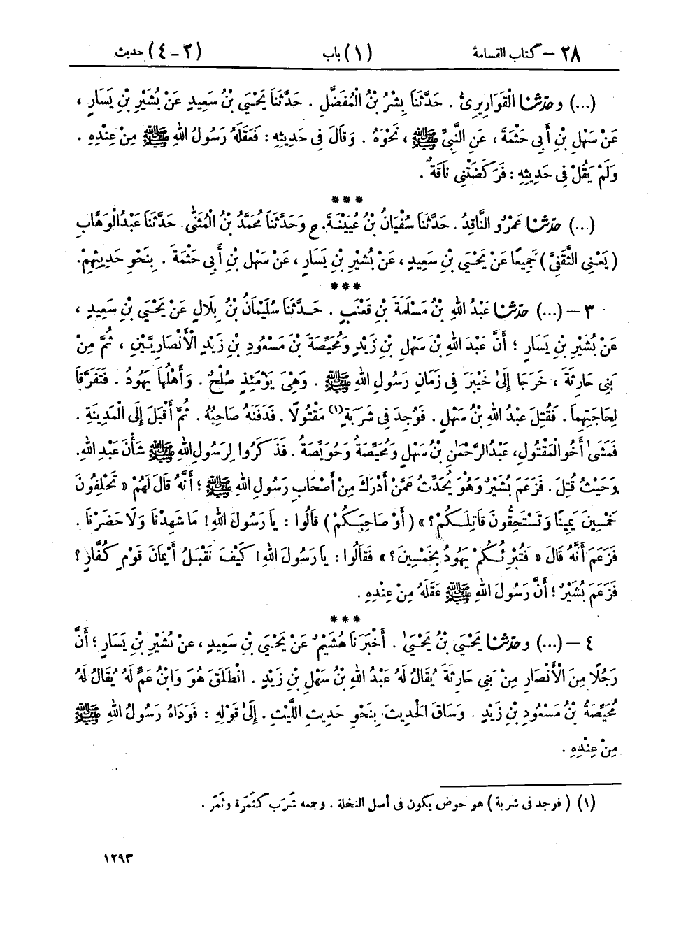 ٤ - (١٦٦٩) وحَدَّثَنَا يَحْيَى بْنُ يَحْيَى، أَخْبَرَنَا هُشَيْمٌ، عَنْ يَحْيَى بْنِ سَعِيدٍ، عَنْ بُشَيْرِ بْنِ يَسَارٍ، أَنَّ رَجُلًا مِنَ الْأَنْصَارِ مِنْ بَنِي حَارِثَةَ يُقَالُ لَهُ: عَبْدُ اللهِ بْنُ سَهْلِ بْنِ زَيْدٍ انْطَلَقَ هُوَ وَابْنُ عَمٍّ لَهُ يُقَالُ لَهُ: مُحَيِّصَةُ بْنُ مَسْعُودِ بْنِ زَيْدٍ وَسَاقَ الْحَدِيثَ بِنَحْوِ حَدِيثِ اللَّيْثِ إِلَى قَوْلِهِ فَوَدَاهُ رَسُولُ اللهِ صَلَّى اللهُ عَلَيْهِ وَسَلَّمَ مِنْ عِنْدِهِ، قَالَ يَحْيَى، فَحَدَّثَنِي بُشَيْرُ بْنُ يَسَارٍ، قَالَ: أَخْبَرَنِي سَهْلُ بْنُ أَبِي حَثْمَةَ، قَالَ: لَقَدْ رَكَضَتْنِي فَرِيضَةٌ مِنْ تِلْكَ الْفَرَائِضِ بِالْمِرْبَدِ،