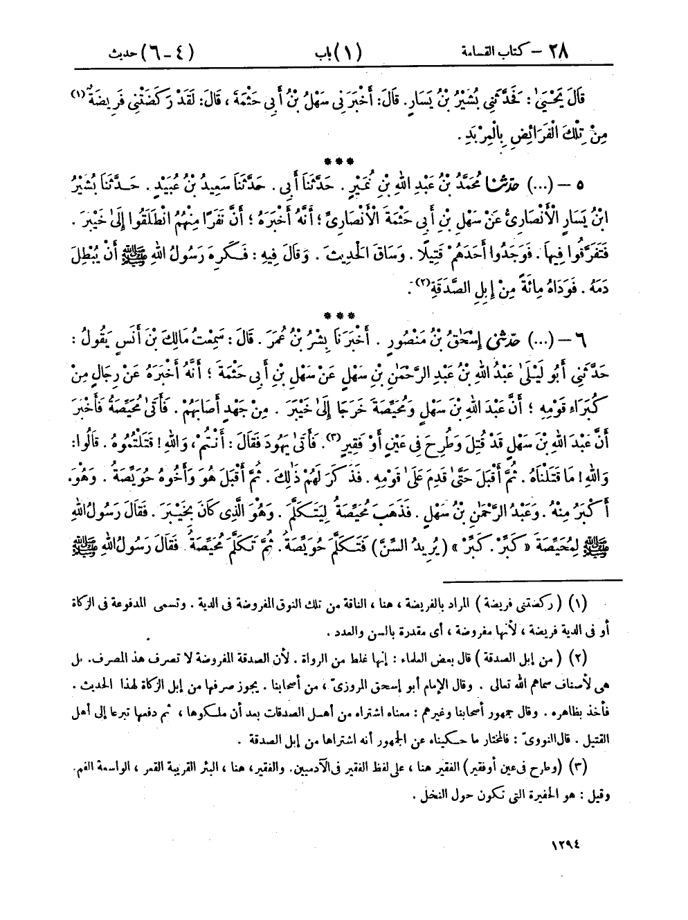 ٦ - (١٦٦٩) حَدَّثَنِي إِسْحَاقُ بْنُ مَنْصُورٍ، أَخْبَرَنَا بِشْرُ بْنُ عُمَرَ، قَالَ: سَمِعْتُ مَالِكَ بْنَ أَنَسٍ، يَقُولُ: حَدَّثَنِي أَبُو لَيْلَى عَبْدُ اللهِ بْنُ عَبْدِ الرَّحْمَنِ بْنِ سَهْلٍ، عَنْ سَهْلِ بْنِ أَبِي حَثْمَةَ، أَنَّهُ أَخْبَرَهُ عَنْ رِجَالٍ مِنْ كُبَرَاءِ قَوْمِهِ، أَنَّ عَبْدَ اللهِ بْنَ سَهْلٍ، وَمُحَيِّصَةَ، خَرَجَا إِلَى خَيْبَرَ مِنْ جَهْدٍ أَصَابَهُمْ، فَأَتَى مُحَيِّصَةُ، فَأَخْبَرَ أَنَّ عَبْدَ اللهِ بْنَ سَهْلٍ قَدْ قُتِلَ وَطُرِحَ فِي عَيْنٍ - أَوْ فَقِيرٍ - فَأَتَى يَهُودَ، فَقَالَ: أَنْتُمْ وَاللهِ قَتَلْتُمُوهُ، قَالُوا: وَاللهِ مَا قَتَلْنَاهُ، ثُمَّ أَقْبَلَ حَتَّى قَدِمَ عَلَى قَوْمِهِ، فَذَكَرَ لَهُمْ ذَلِكَ، ثُمَّ أَقْبَلَ هُوَ وَأَخُوهُ حُوَيِّصَةُ وَهُوَ أَكْبَرُ مِنْهُ وَعَبْدُ الرَّحْمَنِ بْنُ سَهْلٍ، فَذَهَبَ مُحَيِّصَةُ لِيَتَكَلَّمَ وَهُوَ الَّذِي كَانَ بِخَيْبَرَ، فَقَالَ رَسُولُ اللهِ صَلَّى اللهُ عَلَيْهِ وَسَلَّمَ لِمُحَيِّصَةَ: «كَبِّرْ كَبِّرْ»، يُرِيدُ السِّنَّ، فَتَكَلَّمَ حُوَيِّصَةُ، ثُمَّ تَكَلَّمَ مُحَيِّصَةُ، فَقَالَ رَسُولُ اللهِ صَلَّى اللهُ عَلَيْهِ وَسَلَّمَ: «إِمَّا أَنْ يَدُوا صَاحِبَكُمْ، وَإِمَّا أَنْ يُؤْذِنُوا بِحَرْبٍ»، فَكَتَبَ رَسُولُ اللهِ صَلَّى اللهُ عَلَيْهِ وَسَلَّمَ إِلَيْهِمْ فِي ذَلِكَ، فَكَتَبُوا إِنَّا وَاللهِ مَا قَتَلْنَاهُ، فَقَالَ رَسُولُ اللهِ صَلَّى اللهُ عَلَيْهِ وَسَلَّمَ لِحُوَيِّصَةَ، وَمُحَيِّصَةَ، وَعَبْدِ الرَّحْمَنِ: «أَتَحْلِفُونَ وَتَسْتَحِقُّونَ دَمَ صَاحِبِكُمْ؟» قَالُوا: لَا، قَالَ: «فَتَحْلِفُ لَكُمْ يَهُودُ»، قَالُوا: لَيْسُوا بِمُسْلِمِينَ، فَوَادَاهُ رَسُولُ اللهِ صَلَّى اللهُ عَلَيْهِ وَسَلَّمَ مِنْ عِنْدِهِ، فَبَعَثَ إِلَيْهِمْ رَسُولُ اللهِ صَلَّى اللهُ عَلَيْهِ وَسَلَّمَ مِائَةَ نَاقَةٍ حَتَّى أُدْخِلَتْ عَلَيْهِمِ الدَّارَ، فَقَالَ سَهْلٌ: فَلَقَدْ رَكَضَتْنِي مِنْهَا نَاقَةٌ حَمْرَاءُ