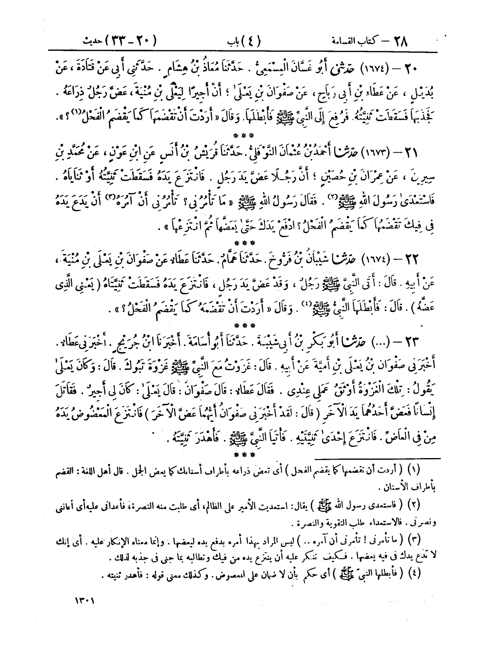 ٢١ - (١٦٧٣) حَدَّثَنَا أَحْمَدُ بْنُ عُثْمَانَ النَّوْفَلِيُّ، حَدَّثَنَا قُرَيْشُ بْنُ أَنَسٍ، عَنِ ابْنِ عَوْنٍ، عَنْ مُحَمَّدِ بْنِ سِيرِينَ، عَنْ عِمْرَانَ بْنِ حُصَيْنٍ، أَنَّ رَجُلًا عَضَّ يَدَ رَجُلٍ، فَانْتَزَعَ يَدَهُ، فَسَقَطَتْ ثَنِيَّتُهُ - أَوْ ثَنَايَاهُ -، فَاسْتَعْدَى رَسُولَ اللهِ صَلَّى اللهُ عَلَيْهِ وَسَلَّمَ، فَقَالَ رَسُولُ اللهِ صَلَّى اللهُ عَلَيْهِ وَسَلَّمَ: «مَا تَأْمُرُنِي؟ تَأْمُرُنِي أَنْ آمُرَهُ أَنْ يَدَعَ يَدَهُ فِي فِيكَ تَقْضَمُهَا كَمَا يَقْضَمُ الْفَحْلُ؟ ادْفَعْ يَدَكَ حَتَّى يَعَضَّهَا، ثُمَّ انْتَزِعْهَا؟»